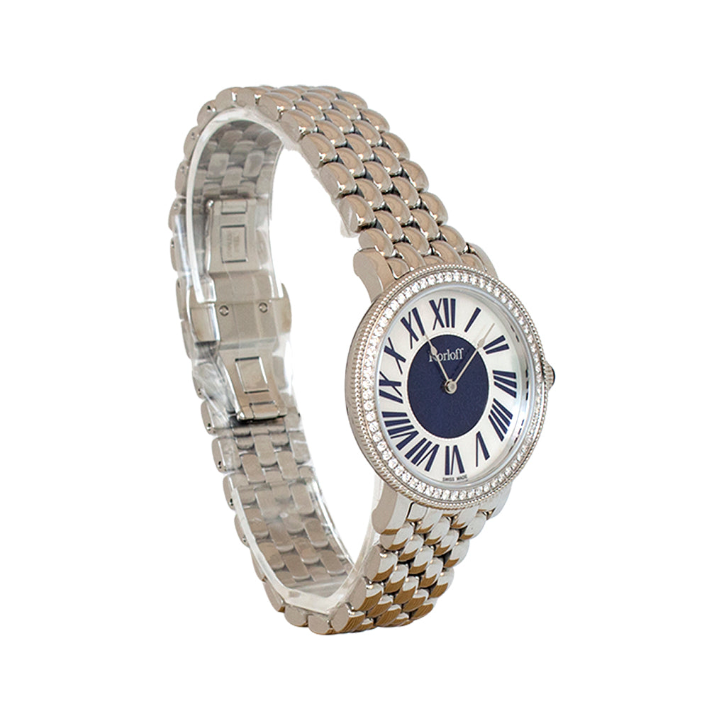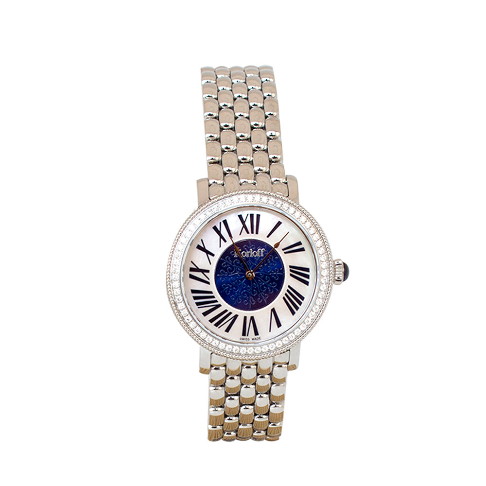 Korloff ladies watch full stainless steel case and bracelet /blue dial mother of pearl with roman number / diamonds on the bezel & sapphire crystal