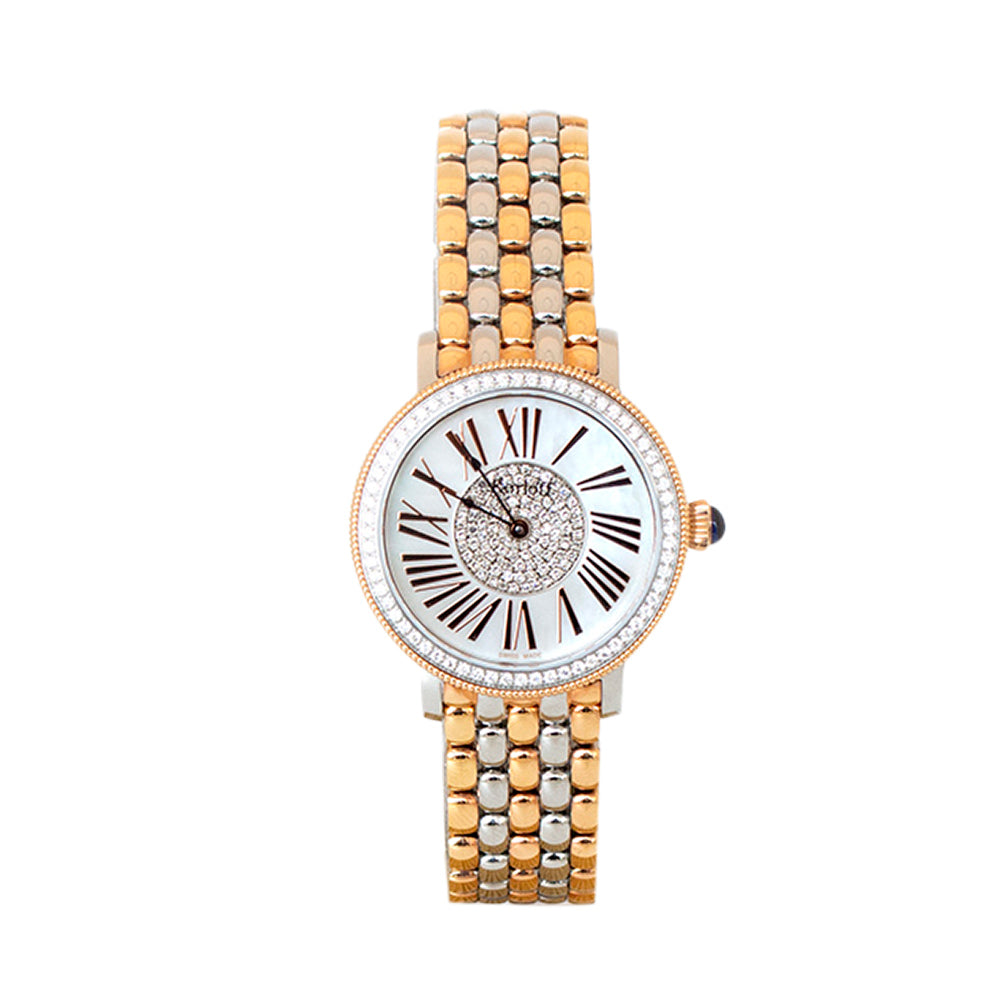 Korloff ladies watch two tone stainless steel case and bracelet with rosegold/full diamond on the bezel & mother of pearl dial with diamond/roman number & sapphire crystal