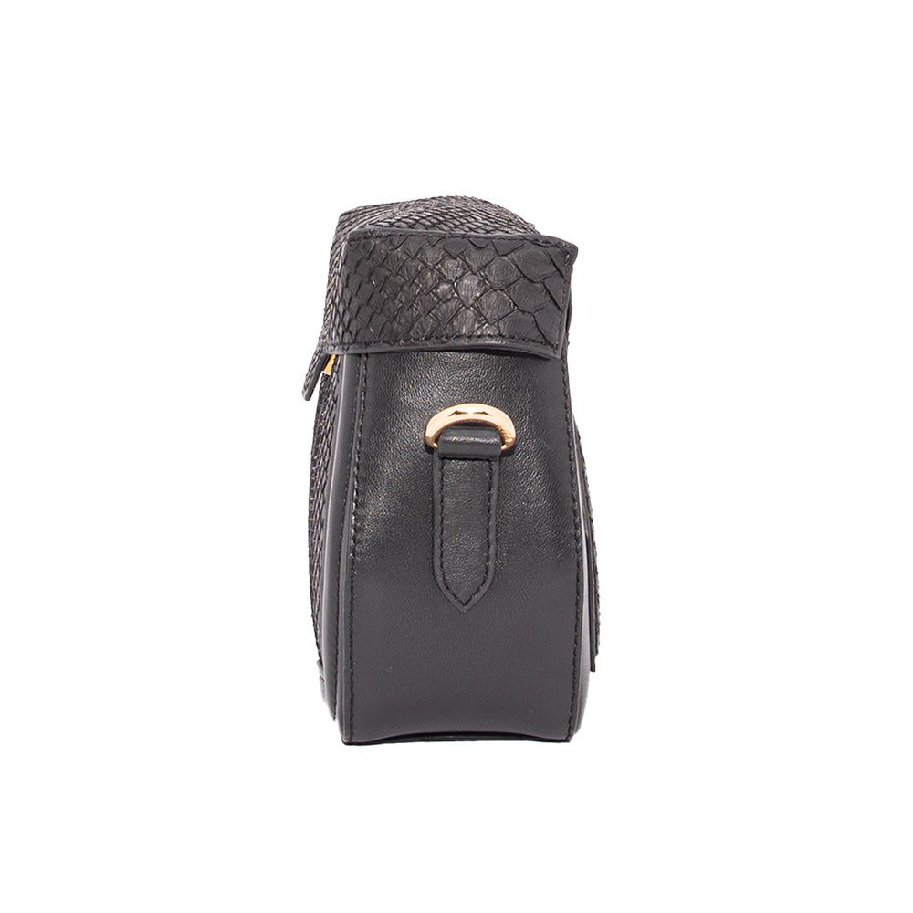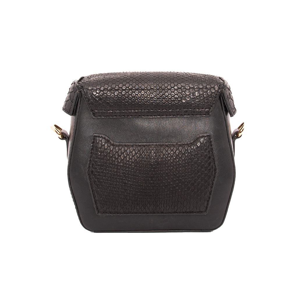 Unique hexagonal shape with distinguished closure, inspired by the shape of cable cars in Grindelwald, Switzerland. Sophisticated in black solid color , roamy and multi function. Wear it with short strap like fashionistas, or swap with longer strap for more casual occasions.