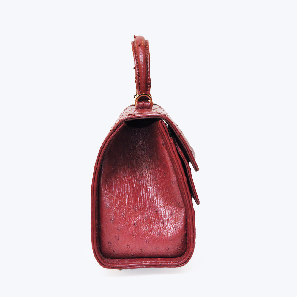 Rubby in small burgundy ostrich printed solid color leather. Our new diva with unique layering closure and adjustable side wing to customize your belongings. As you can see, this is not a large bag but definitely, can load a lot of stuff and super stylish at the same time. Be the trendsetter by using our unique and elegant design.