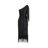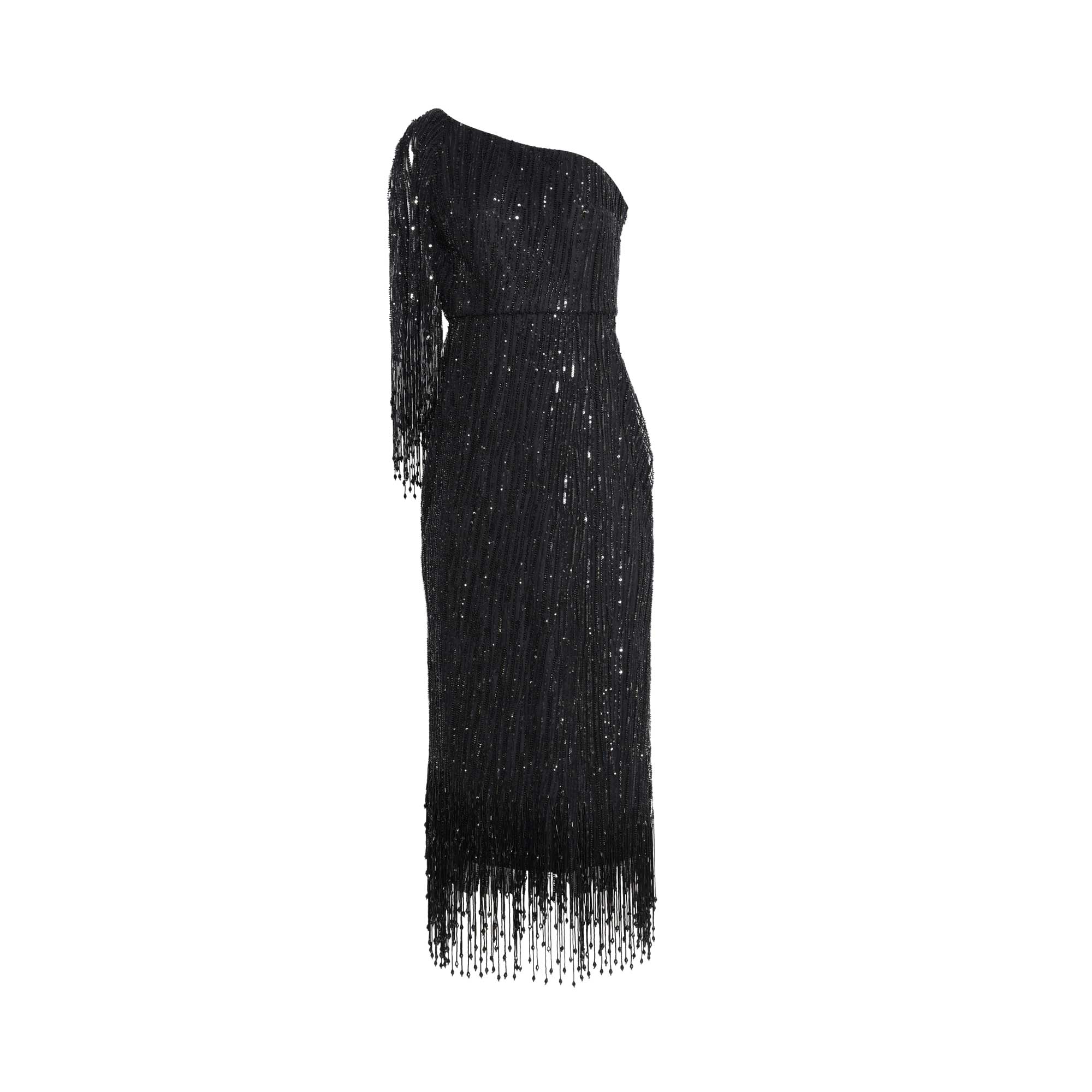 The Velvety Couture Lara Women's Black Dress is a stunning and elegant option for your next special occasion. This sophisticated one-shoulder dress features a flattering medi-length, pencil cut silhouette made from sultry stone sequins and beads. Its unique design is complete with a showstopping one-side, asymmetrical handmade crystal tassel sleeve. Whether you're heading to a gala, a wedding or a cocktail party, you'll be sure to make a lasting impression in this stunning dress. Pair this dress with your favorite heels and simple jewelry for a classic, timeless look. SPECIFICATIONS