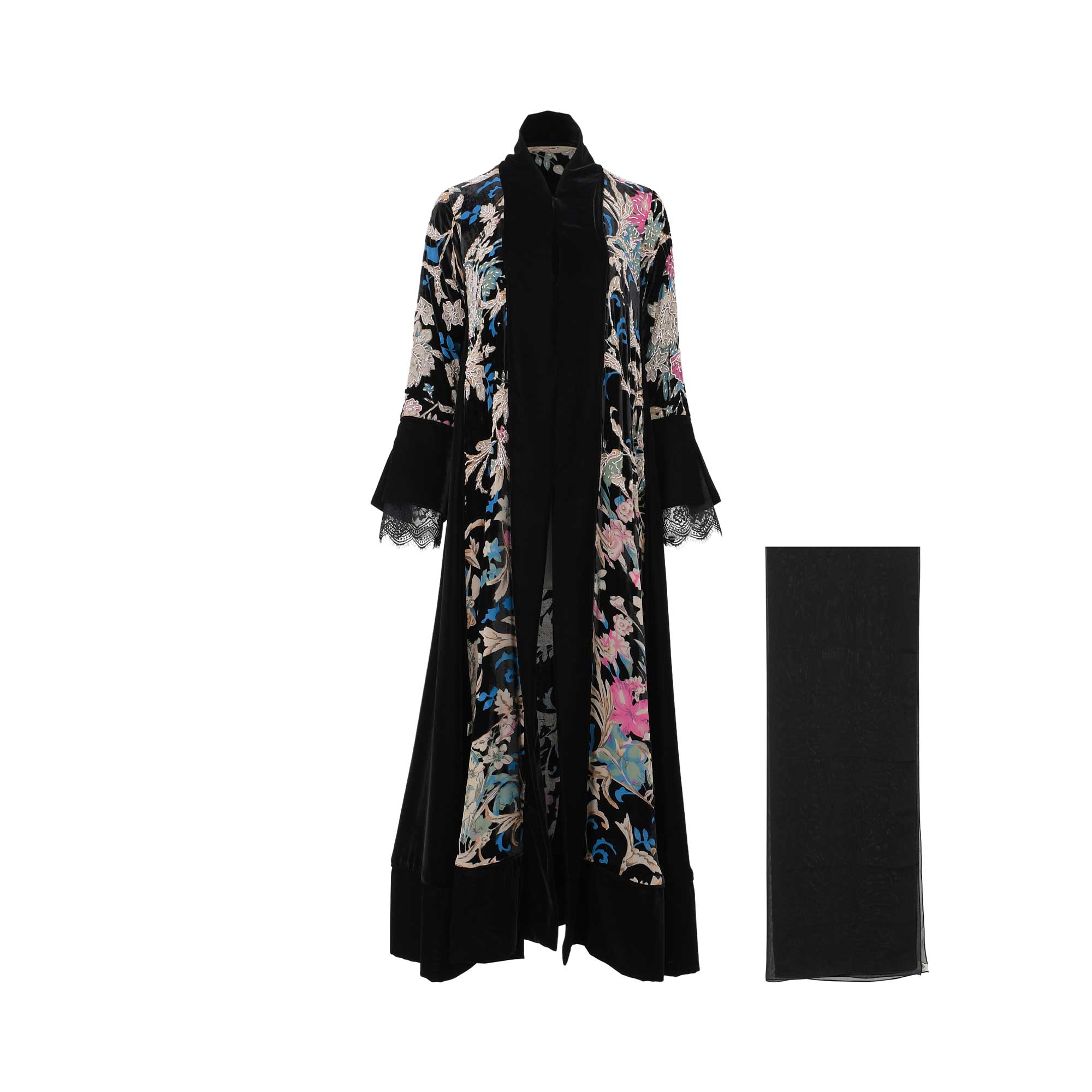 Elevate your evening wardrobe with this exquisite two-piece set from LAMAR. This floor-length abaya is crafted from luxurious black velvet, featuring a vibrant, large-scale floral botanical print in shades of pink, turquoise, and cream.