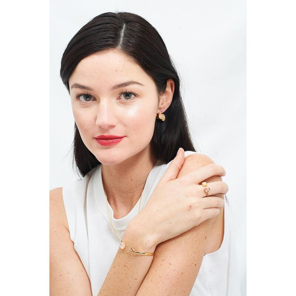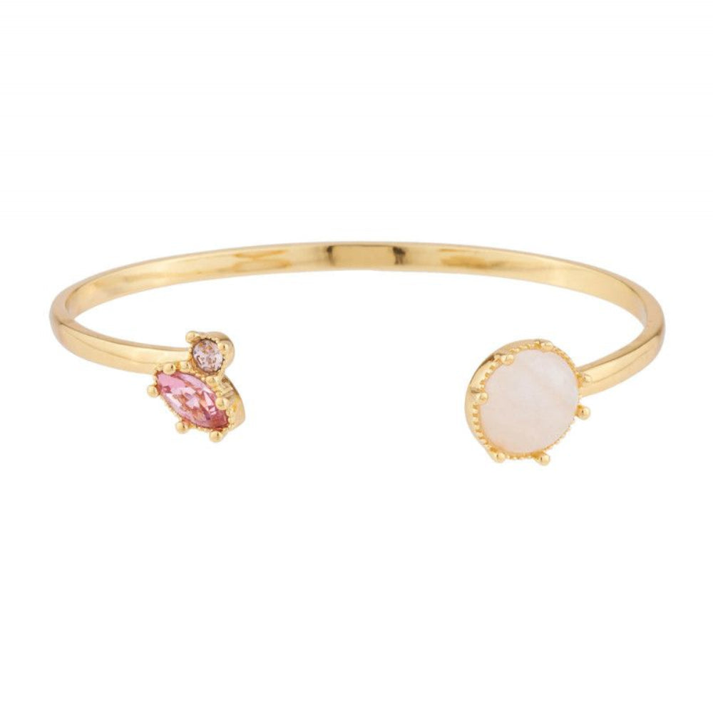 Wear it alone, or with other bracelets of La Maison Les Néréides, this magnificient bangle bracelet will enlight your wrist with elegance. This bangle bracelet for woman is adorned with a pink quartz stone and two rhinestones in a different shades of pink. The bracelet is made up of brass, gilded with 18 karat gold.