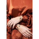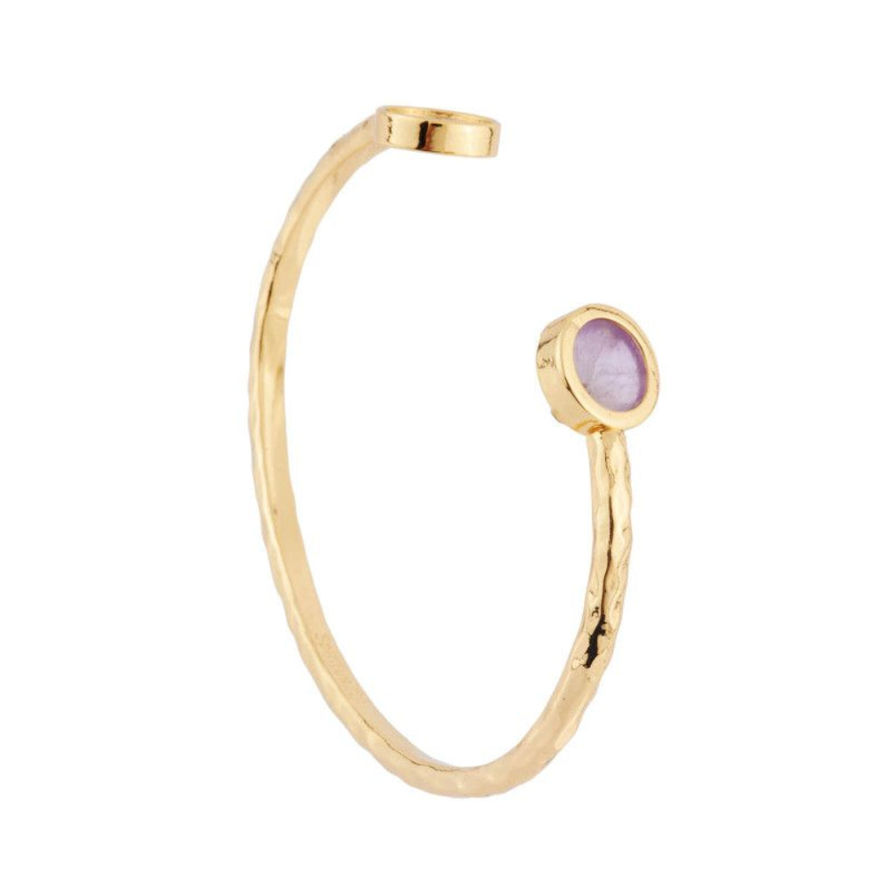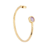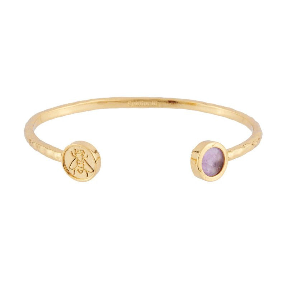 This delicately hammered gorgeous bangle is set with a marbled-like purple faceted stone and a bee standing for spirituality. It is made of brass gilded with 14K fine gold.