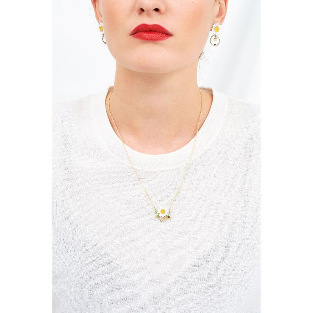 This long necklace for women combines a thin gilded chain with white freshwater pearls and enameled pink pearls, a glowing daisy with a yellow heart surrounded with green leaves with a smal ladybird, and a pink round hand-carved glass stone, mounted on the center of the piece. All elements of this piece of jewellery, including the necklace chain, are made in 14 carat gold plated brass and hand enameled, respecting Les Néréides - Paris' pure creation tradition.