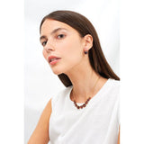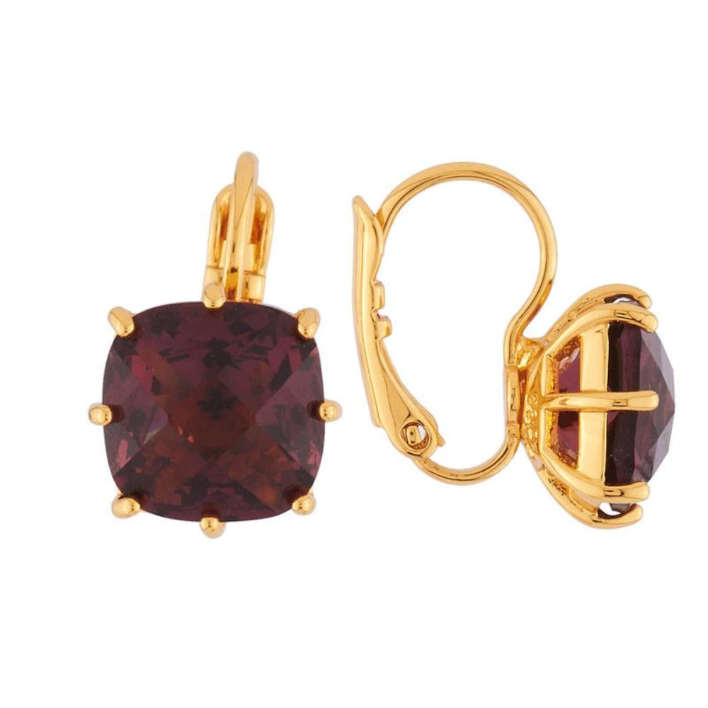 These earrings for women are made up of a small plum coloured square hand-carved glass stone, respecting Les Néréides - Paris ' pure creation tradition. This piece of jewellery’ setting is made up in 14 carat gold plated brass.