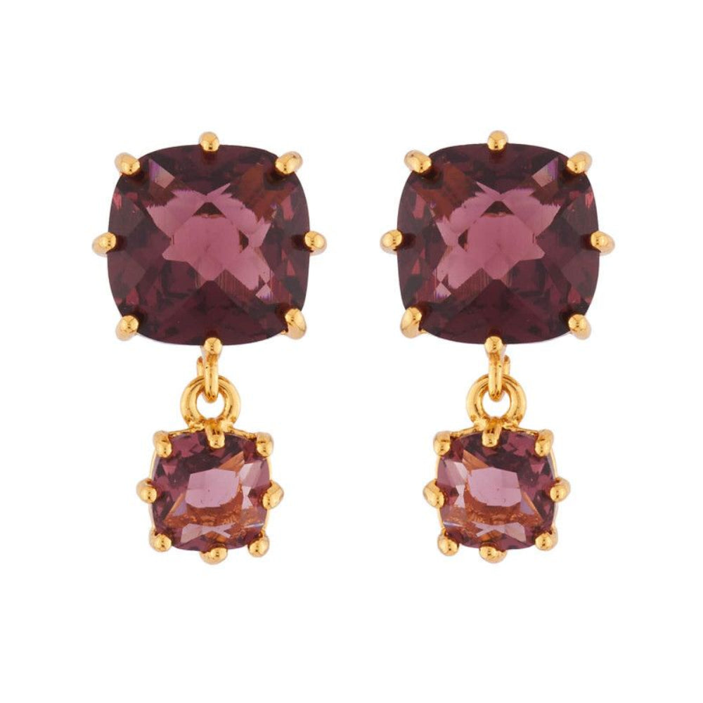 These Earrings For Women Are Made Up Of Two Plum Coloured Square Hand-Carved Glass Stones, Respecting Les Néréides - Paris ' Pure Creation Tradition. This Piece Of Jewellery’ Setting Is Made Up In 14 Carat Gold Plated Brass.