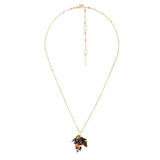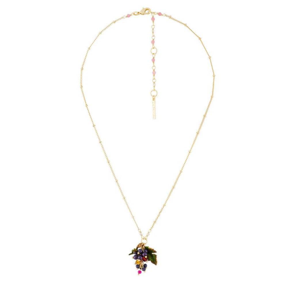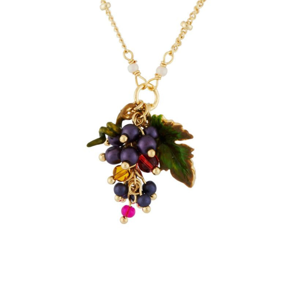 This piece of jewellery is made up of a bunch of grapes made of a glass pearls hanging from a vine leaf made of brass and hand enamelled in pure Néréides Paris tradition. As for the chain it is made of 14 carat gold plated brass