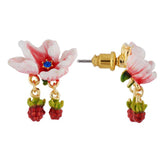 This pair of earrings is made up of a red and white flower in full bloom with a rhinestone in the middle and small red fruits hanging from it made from hand enamelled brass in pure Néréides Paris tradition.