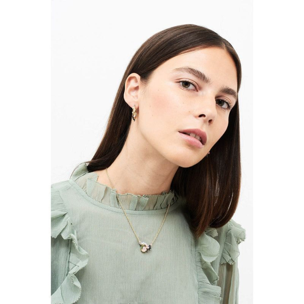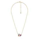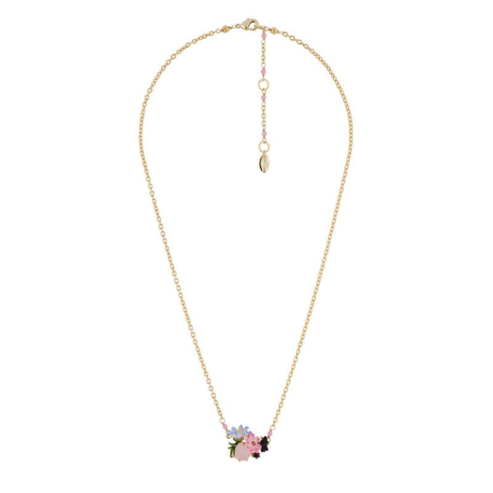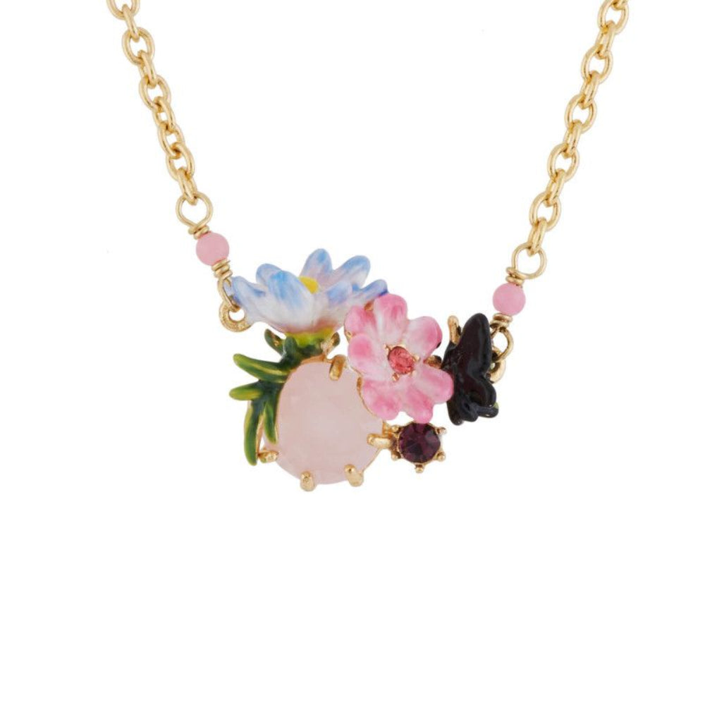 Adorn your neck with colors thanks to the cut glass and small flowers pendant necklace. The hand enameling of this costume necklace, especially on the flowers and the butterflies offers a powerful level of detail. The flower pistil is represented by a tone-on-tone rhinestone.