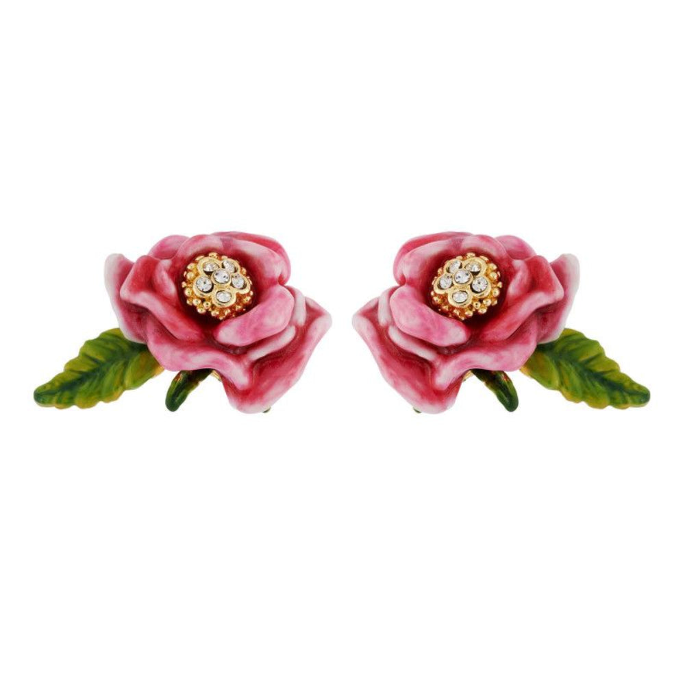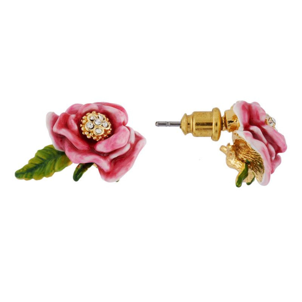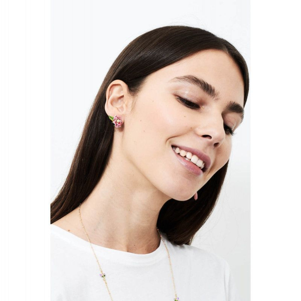 This piece of jewellery is made up of a pink flower in its foliage made of hand enamelled brass in pure Nereides Paris tradition. The centre of the flower is a fresh water pearl.