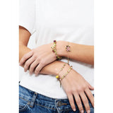 This piece of jewellery is made up of a hand enamelled flower, a hand carved stone and a rhinestone reviving the sparkle and shine of the bracelet. The 14 carat gold plated brass semi beaded chain will bring a note of softness to your wrist