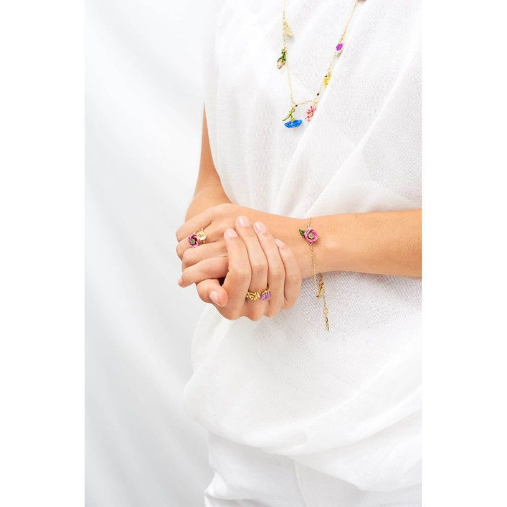 Discover Our Pink Flower With Rhinestone Pistil Bracelet ! This Bracelet Is Made Up In A 14Kt Gold Plated, Hand Enameled Brass. This Piece Of Jewellery For Woman Is Delicatly Adorned With Rhinetsones Et De Hand Faceted Glass The Chain Of This Bracelet For Woman Is Made Up Of 14Kt Gold Plated Brass And Is Adorned With Fantasy Beads. A Pure And Unique Creation Made By Les Néréides - Paris.