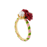 This piece of jewellery is made up of two roses made from hand enamelled brass in pure Néréides Paris tradition, a fresh water pearl, and a delicate rhinestone bringing sparkle and shine to this piece. As for the band, is made of 14 carat gold plated brass.