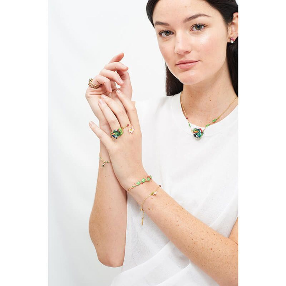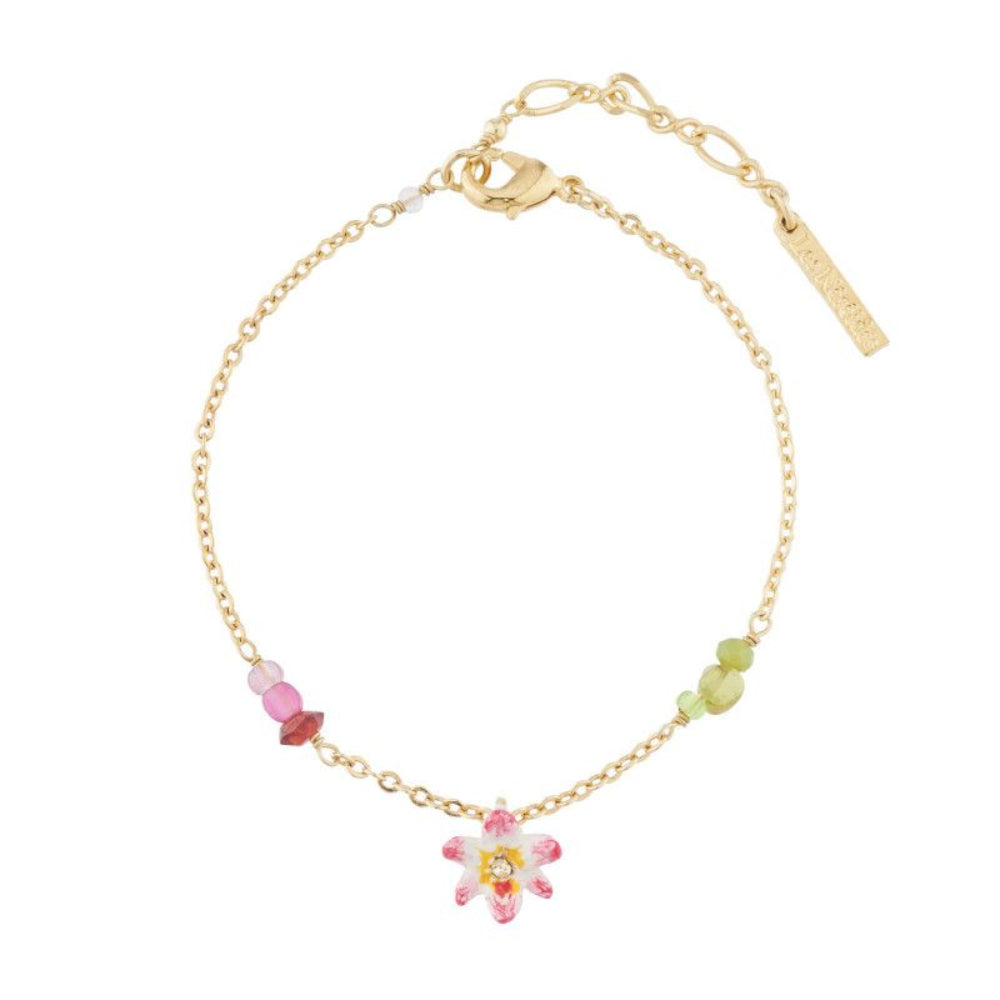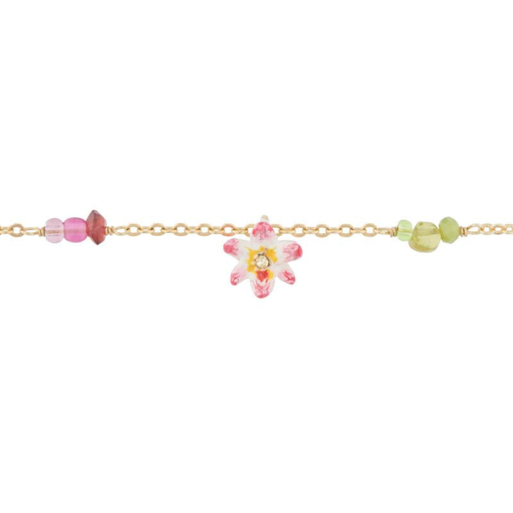 A Touch Of Simplicity For This Bracelet Revealing A Tropical Flower And Glass Beads From The "Luxuriant Canopy" Collection. With Its Chain Made Of Brass And Gilded With 18 Karat Gold, This Jewel Comes With A Delicate Hand-Enamelled Pendant In The Form Of A Tropical Flower. That Flower Is Adorned With Pink And Green Glass Beads. It Is The Ideal Accessory For A Subtle Touch On Your Wrist!