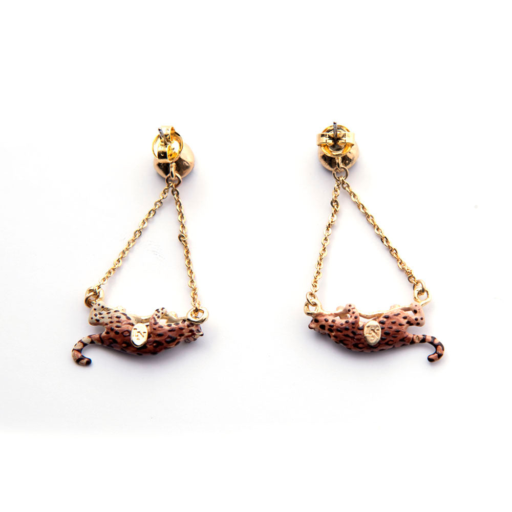 Fiercely Creative, These Dangling Wild Ocelot Earrings From The "Luxuriant Canopy" Collection Will Bring Out The Child In You. The Hand-Enamelled Wildcat Figurine Is Bound To A Rod Held By Two Chains Made Of Brass Gilded With 18 Karat Gold. To Top It All, This Women'S Earrings Have A Delicate Black Rhinestone At Their Base.