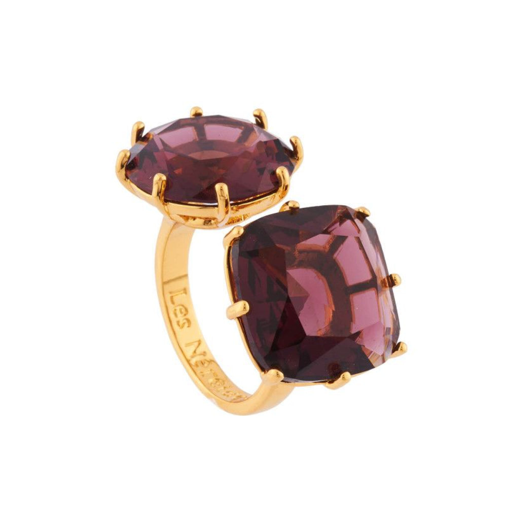This open ring for women is made up of one round and one square shaped plum coloured hand-carved glass stones, respecting Les Néréides - Paris ' pure creation tradition. This piece of jewellery’ setting is made up in 14 carat gold plated brass.