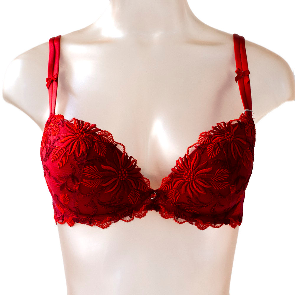 This bra provides a pretty curved looks and graciously underscores the breast. Its red color will add warmth to your look and enhance your skin tone. A floral creation, attractive colors and very feminine seduction.