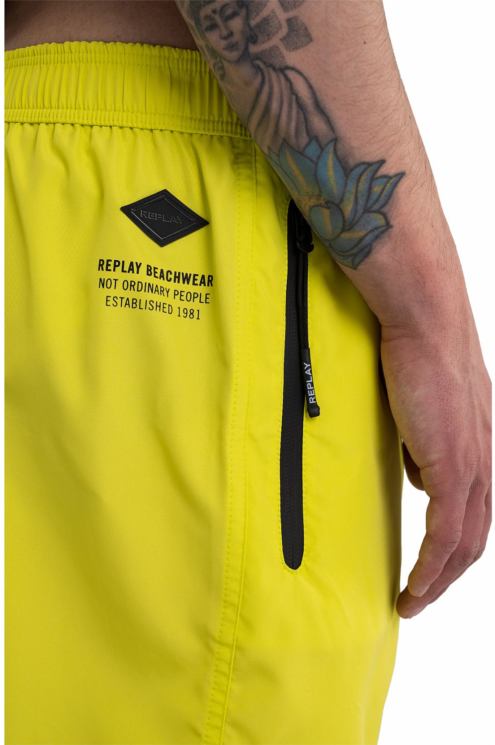 Solid-coloured swimming trunks with regular fit. With logoed drawstring, the garment is equipped with a zipped pocket on the side. The item is enhanced by the triangle-shaped label on the left side and by the customized print at the back. Inner lining in nylon.