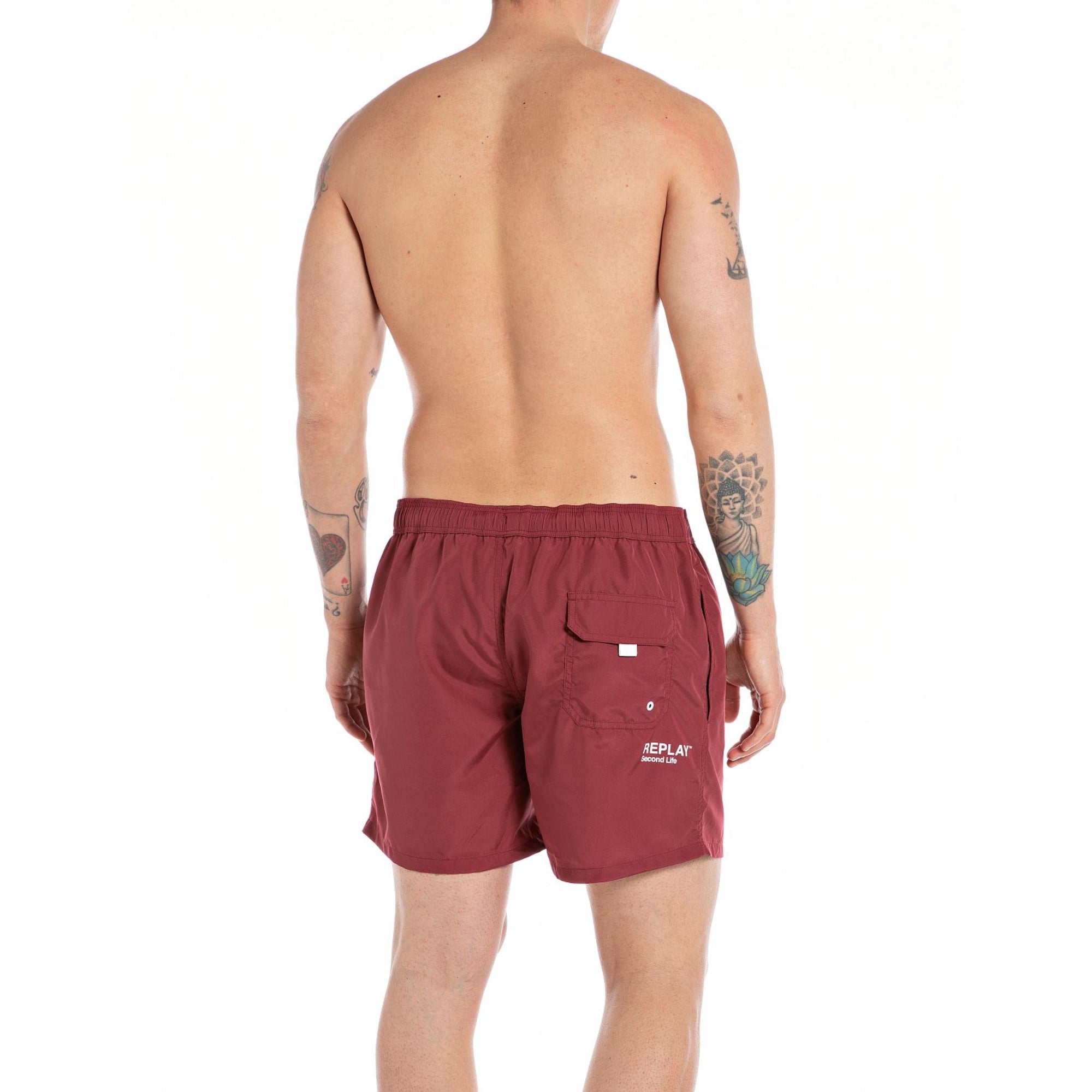 Solid-colored swimming trunks made of recycled poly. With regular fit, the garment is equipped with a drawstring at the waistband. The item with two vertical pockets and one flap pocket with velcro at the back is enhanced by the triangle-shaped label on the left side and by the customized print at the front and at the back. Inner lining in nylon.