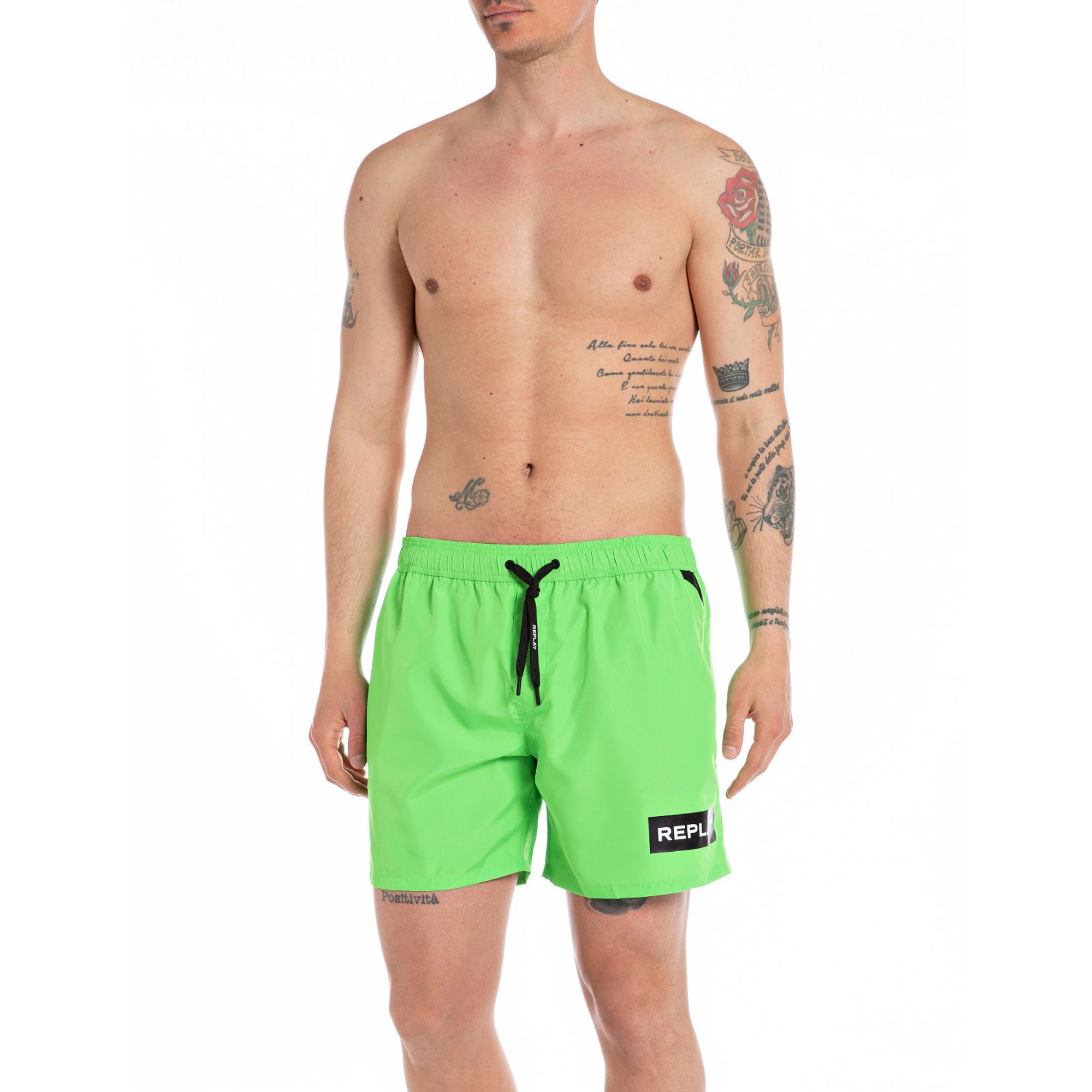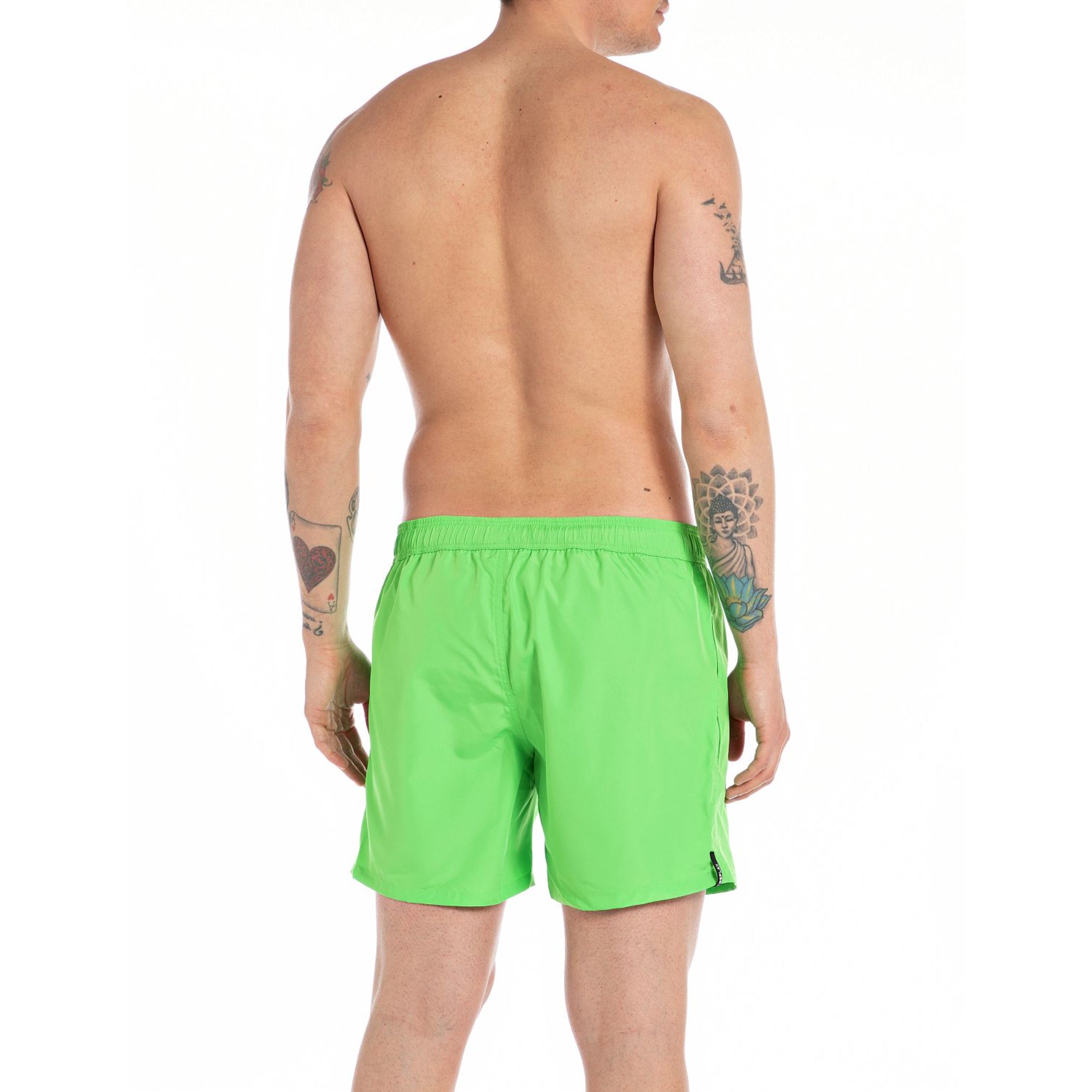 Solid-colored swimming trunks with regular fit. With logoed drawstring, the garment is equipped with vertical pockets on the side. The item is enhanced by the triangle on the left side and the personalized contrasting-colored at the hem. Inner lining in nylon.