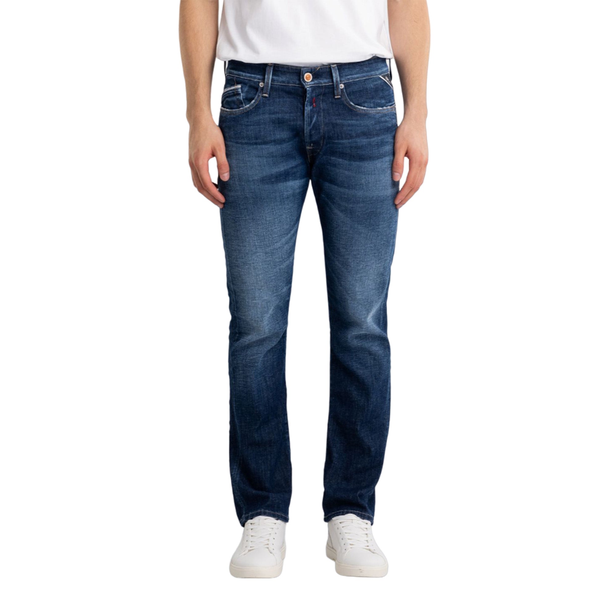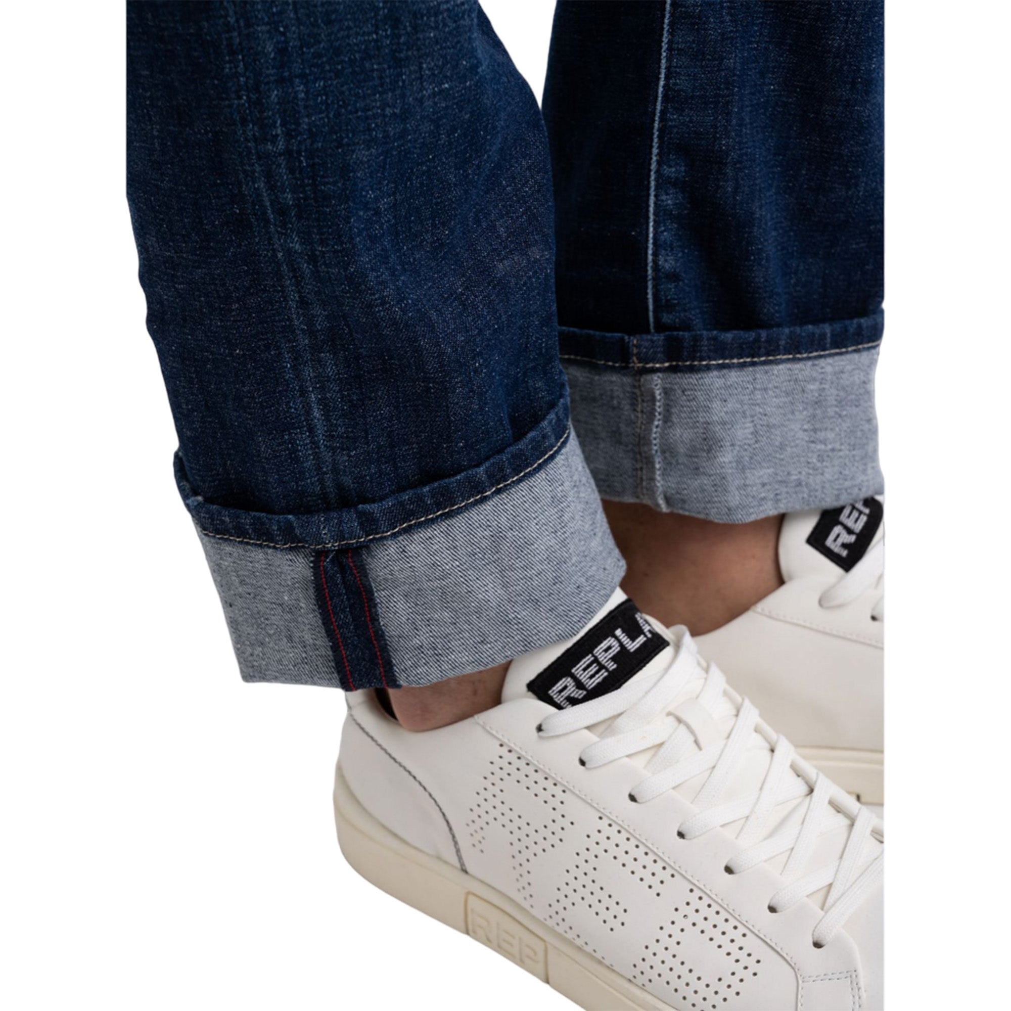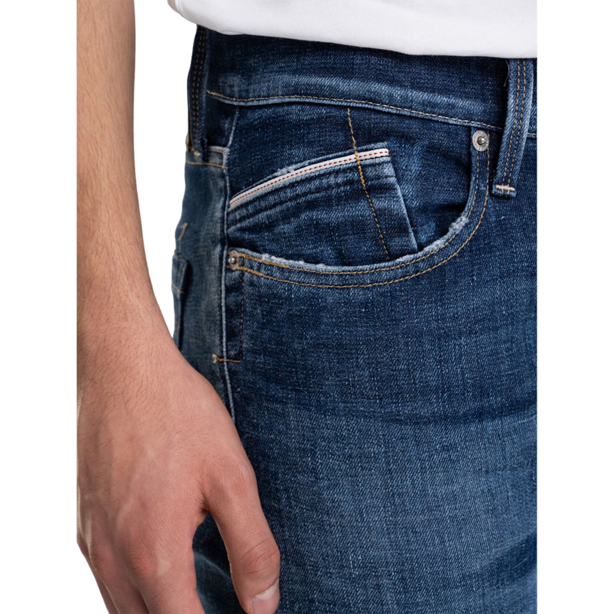 Regular fit jeans with regular waist and straight leg for a comfortable wear. With a vintage touch, the garment is made of 11 oz recycled 360° indigo comfort recycled denim with a dark wash tone. The five pockets piece is characterized by the enzyme treatment with handmade whiskers and scrapings which create horizontal creases for a used effect. With button fastening, the trousers are refined by the contrasting-colored selvedge on the coin pocket.