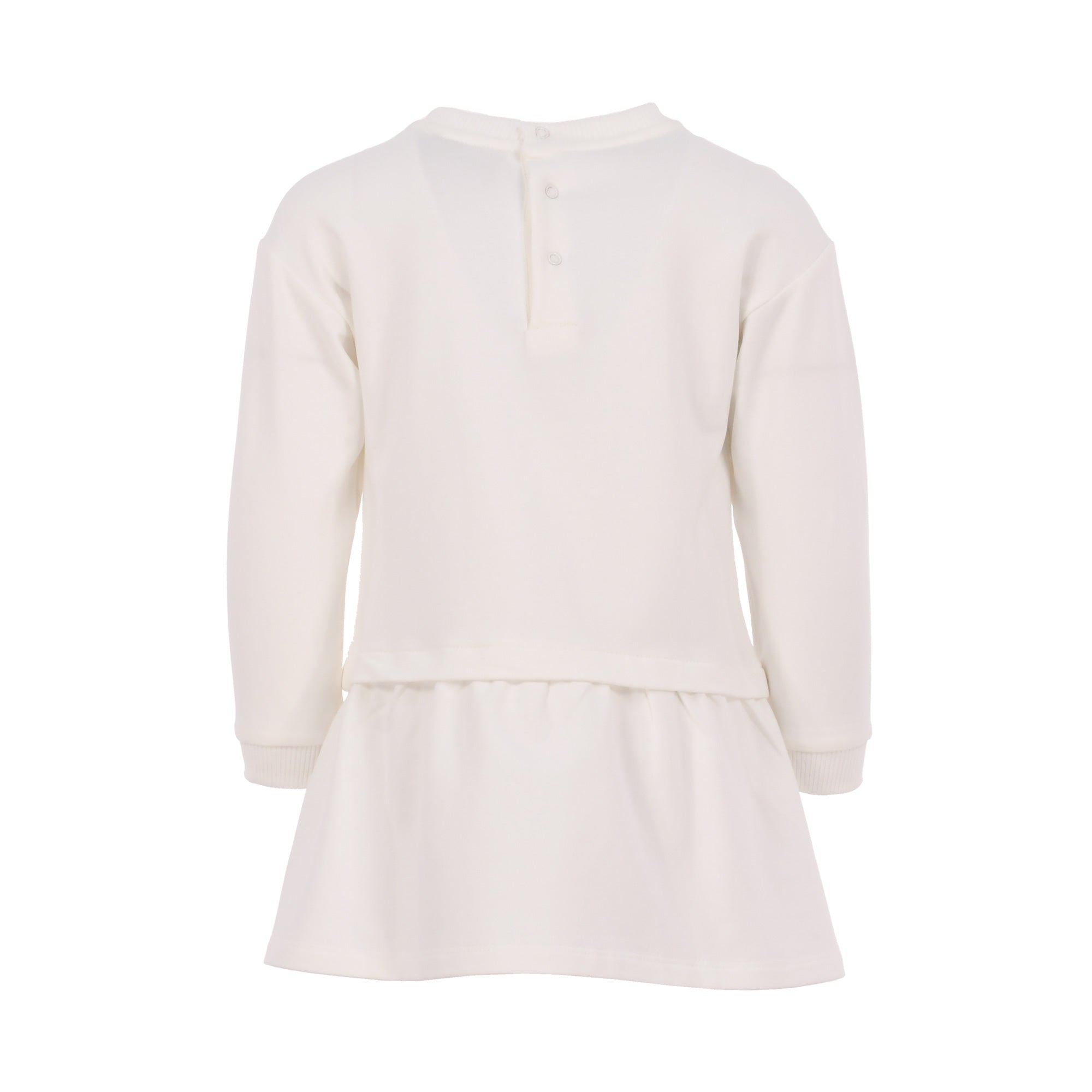| Moschino cloud white cotton jersey dress for little girls. It has cute shoulder frills and a Moschino Teddy Bear print on the front, with sparkly diamanté love hearts underneath. The popper fastenings on the back make dressing simple, and the material allows for some stretch, so you can wear it all day. SPECIFICATION :