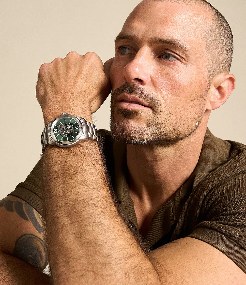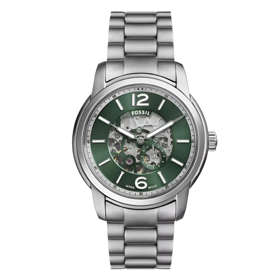 The Fossil Heritage Gents Automatic Stainless Steel Watch is a stylish and sophisticated timepiece designed for men. It features a unique three-piece case with a stepped profile, giving it a distinctive look. The case is made of durable stainless steel, ensuring that the watch is built to last. One of the standout features of this watch is its green skeleton dial, which allows you to see the intricate inner workings of the precision automatic movement. This adds a touch of sophistication and elegance to the watch, making it a conversation starter. The dial is protected by a double-domed, scratch-resistant sapphire crystal, which ensures that the watch face remains clear and free from scratches. This also adds to the overall durability of the watch. The Fossil Heritage Gents Automatic Stainless Steel Watch comes with a three-link stainless steel bracelet, providing a comfortable and secure fit on the wrist. The strap color is silver, giving the watch a classic and timeless look. With a water resistance of 5 ATM, this watch is suitable for everyday wear.The Fossil Heritage Gents Automatic Stainless Steel Watch is a versatile and high-quality timepiece that combines style, functionality, and durability.