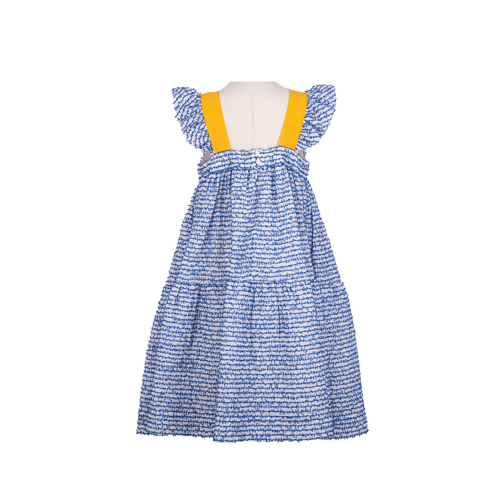 Beautiful blue poplin dress for girls by Mimisol. It has grosgrain shoulder straps and dress has a stitched stripes with frayed details. Fasten with back button and concealed zip closures.