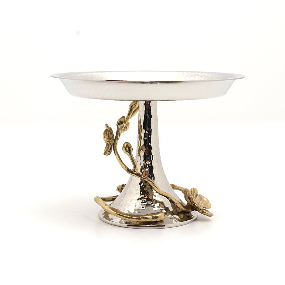 Stainless steel, nickelplate, adorned with a golden orchid sculpture in natural bronze