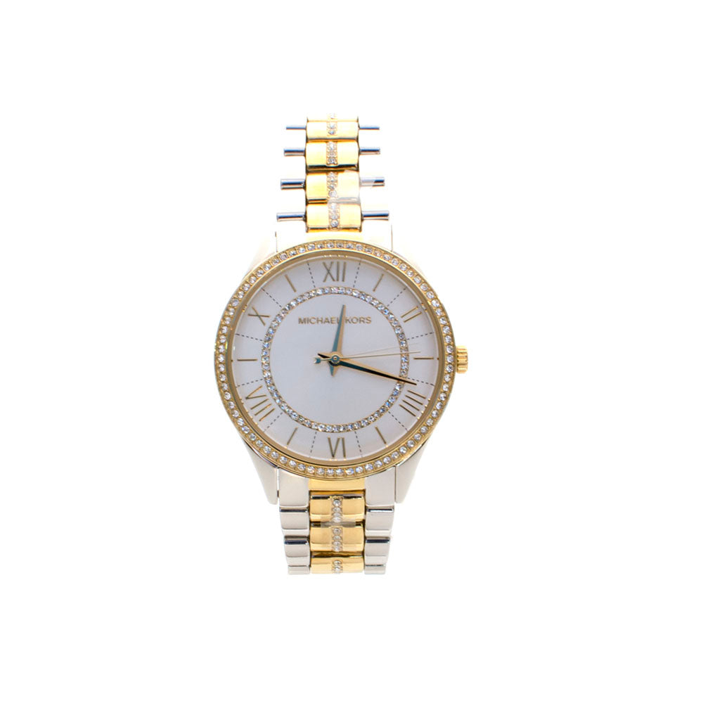 Michael kors ladies watch gold & silver plated metal bracelet, silver case and gold plated bezel with crystal