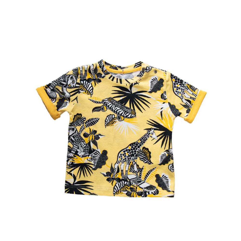 The Roberto Cavalli Yellow Printed T-Shirt is a uniquely stylish and luxuriously crafted garment. This t-shirt is designed with a classic crew neck and short sleeves for a casual, everyday look. It stands out thanks to its unique feature of having a press-stud fastening at one shoulder, giving the t-shirt an element of unexpected luxury. This modern t-shirt has been crafted from a pure cotton fabric, and features an all-over animalier and tree print, along with the brand logo. The sleek straight hem gives the t-shirt a contemporary finish. Ideal for numerous occasions, this Roberto Cavalli t-shirt is sure to become a valued addition to any wardrobe. SPECIFICATIONS