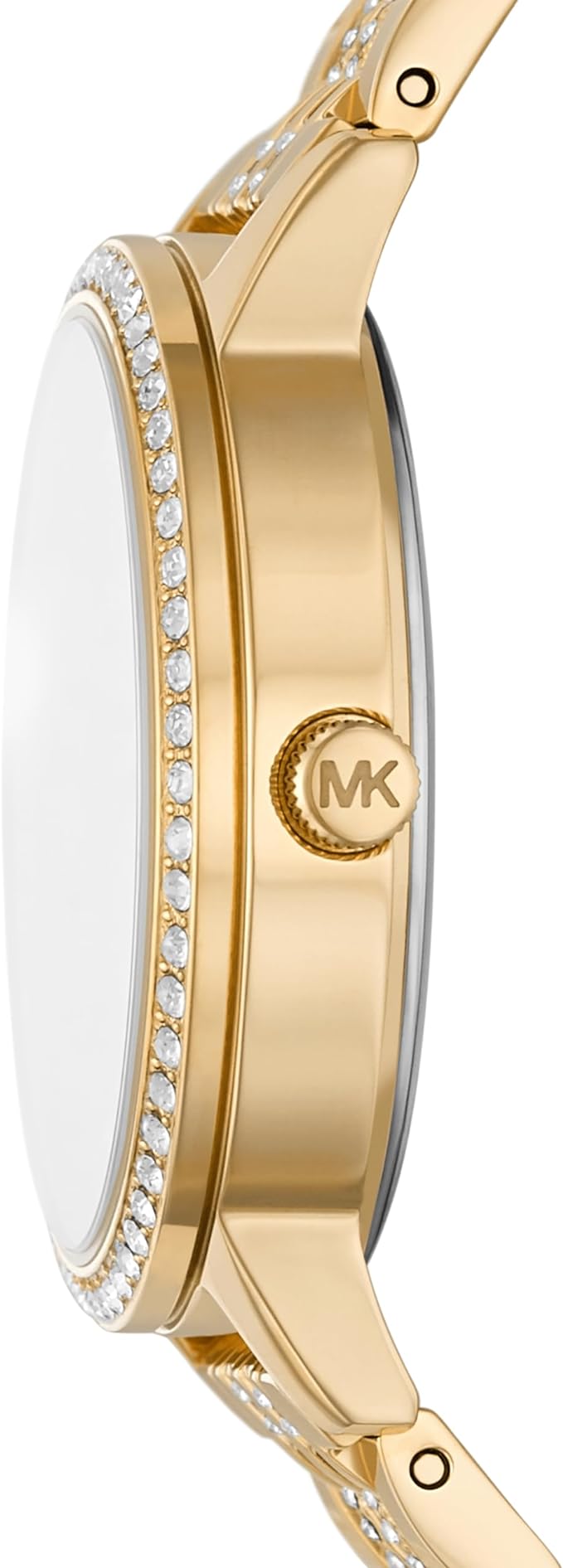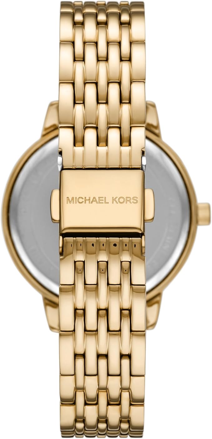 The Michael Kors Melissa Ladies Stainless Steel Gold Tone Watch is a stylish and elegant timepiece. It has a 36mm case and a 16mm band width, making it a medium-sized watch suitable for most wrist sizes. The watch features a durable mineral crystal that protects the dial from scratches and cracks. It is also equipped with a Quartz movement, known for its accuracy and reliability, and has a 3-hand analog display for easy time reading. The round stainless steel case adds a touch of sophistication to the overall design of the watch. The gold dial adds a luxurious and classy element to the watch, making it a perfect accessory for any formal or casual occasion.