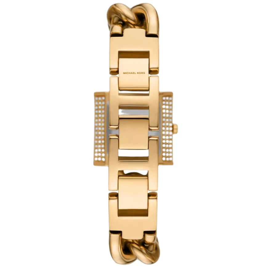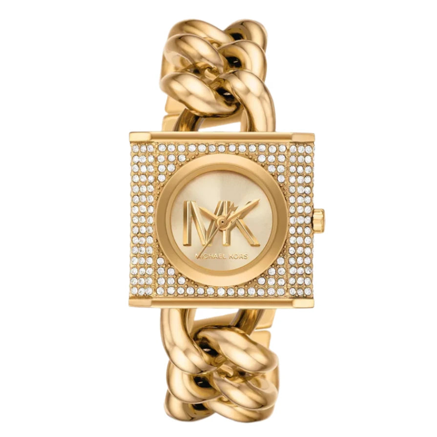 Michael Kors' 25mm MK Chain Lock watch features a gold logo dial, pavé case, three-hand movement and gold-tone stainless steel bracelet.