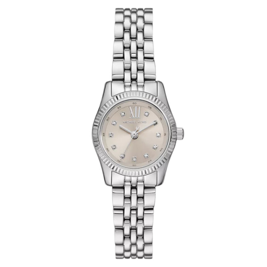 The Michael Kors Lexington Ladies Three-Hand Stainless Steel Watch is a stunning accessory that seamlessly combines elegance with functionality. Featuring a sophisticated 26mm oyster sunray dial, this watch offers a refined look that enhances any outfit. The three-hand movement ensures precise timekeeping, making it both stylish and practical for daily wear. Encased in a sleek stainless steel bracelet, the watch boasts a modern silver strap that complements its upscale design. With a water resistance of 5 ATM, this timepiece is not only chic but also durable, allowing you to wear it with confidence in various settings, from casual outings to formal events. Whether you're treating yourself or searching for the perfect gift, the Michael Kors Lexington watch is an excellent choice for any fashion-forward individual.