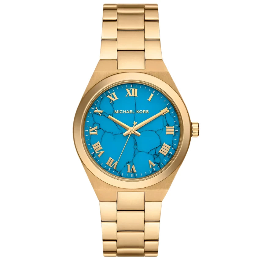Michael Kors' 37mm Lennox watch features a turquoise colored dial, three-hand movement and gold-tone stainless steel bracelet.