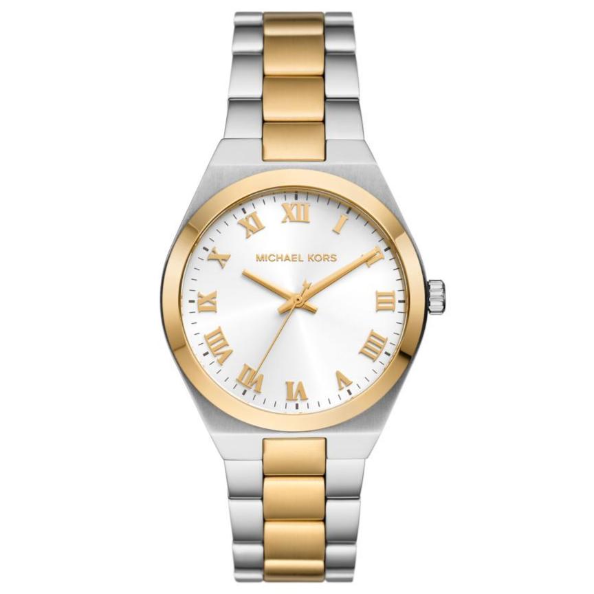 Michael Kors' 37mm Lennox watch features a white sunray dial, three-hand movement and two-tone stainless steel bracelet.