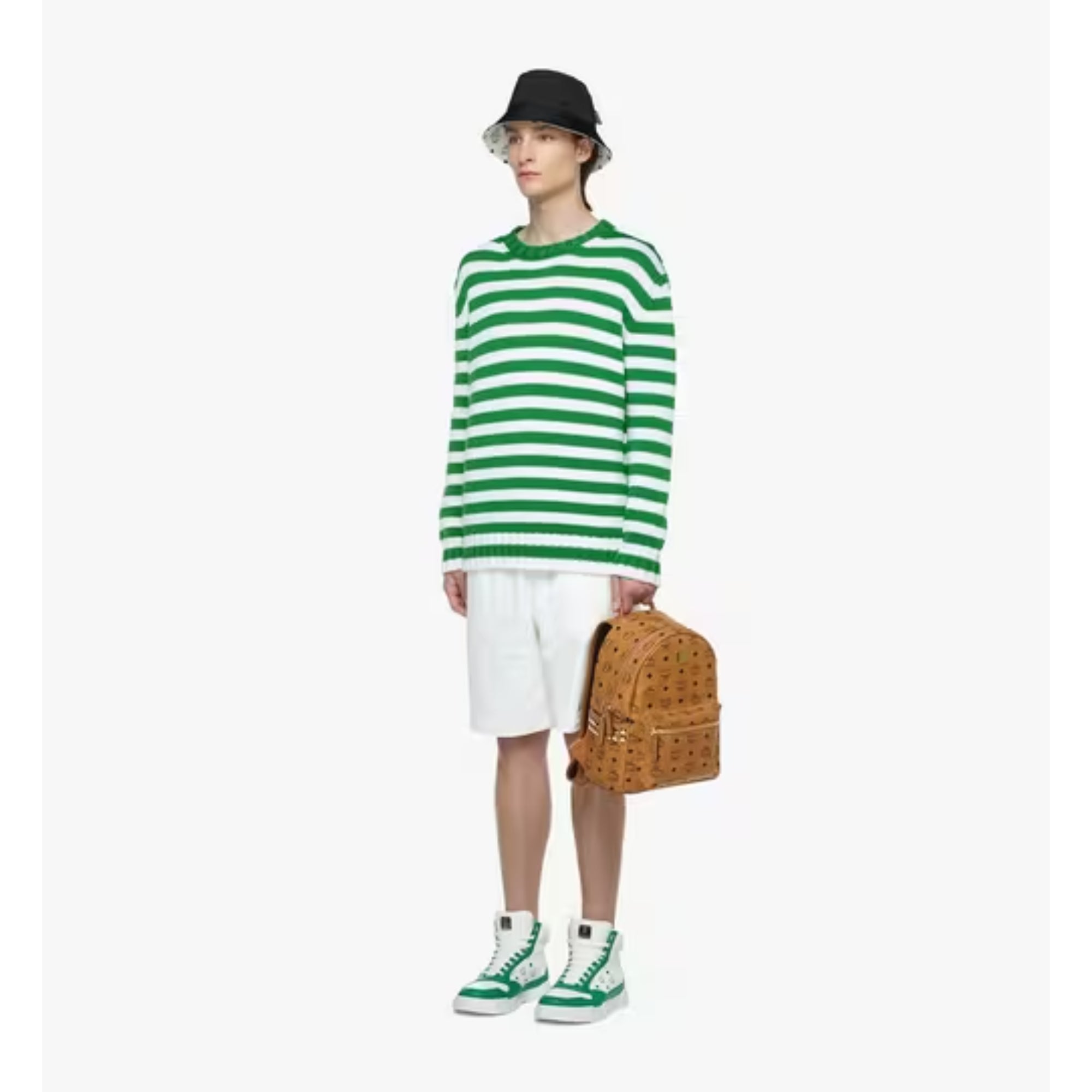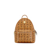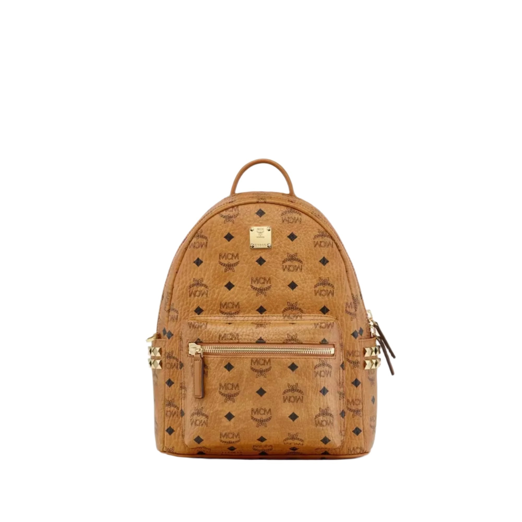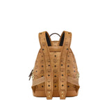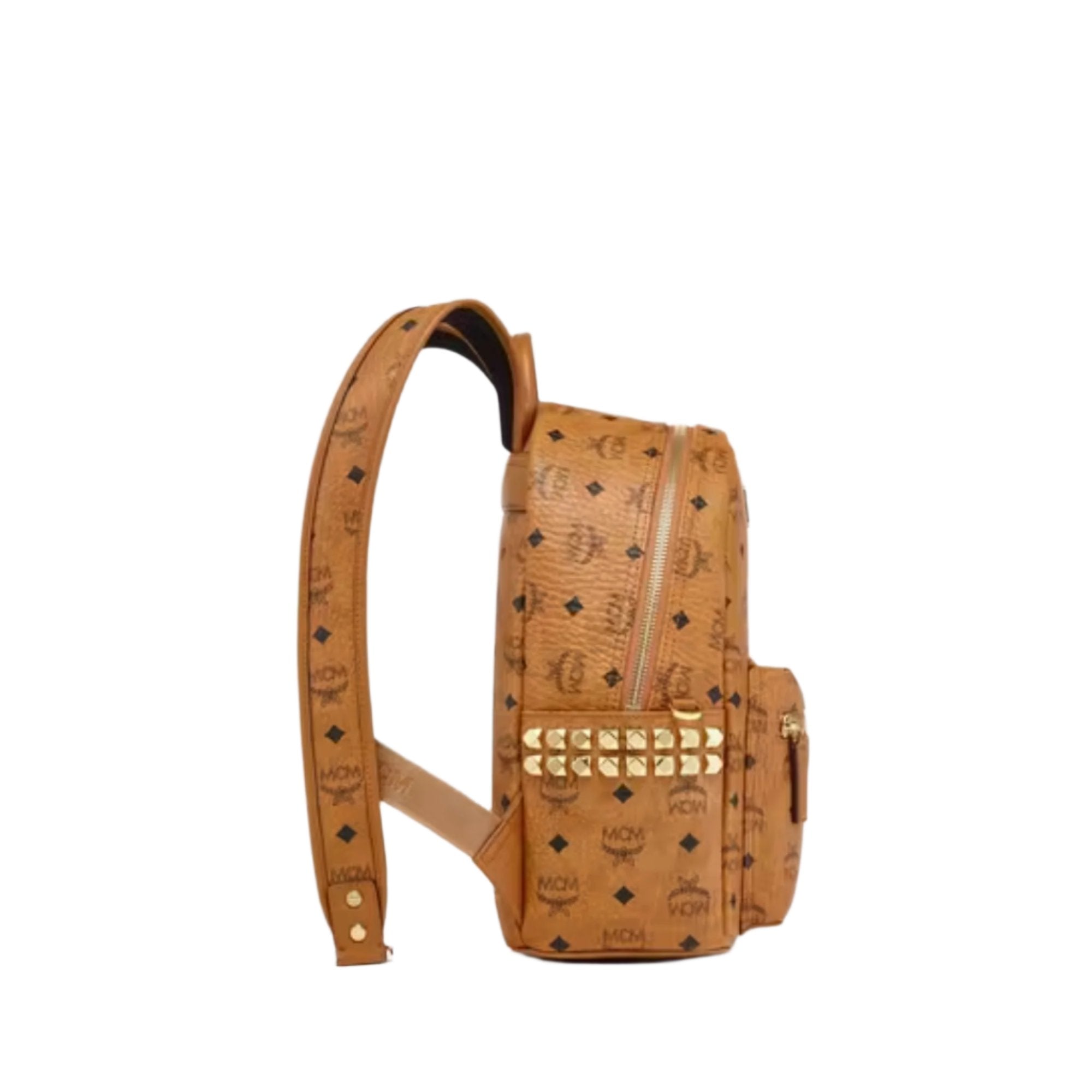 Crafted from signature Italian Visetos, the small Stark backpack is enriched by smooth nappa leather accents in classic cognac. Pyramid stud embellishments frame the iconic silhouette for a touch of gilded brilliance.