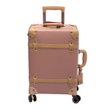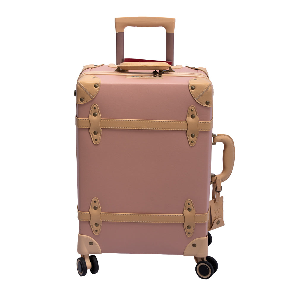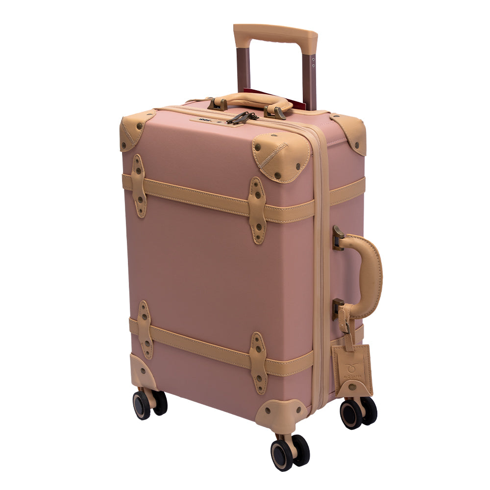 | Mosafer Vintage Carry-on Small Pink, The Mosafer Vintage Spinner Suitcase is an amazing piece of luggage for the discerning traveller, inspired by vintage travel trunks. It is fully movable on four swivel castor wheels and has a telescopic handle, top and side carry handles for hoisting into overhead bins, and typical PVC details throughout. The well-organized interior features luggage retention straps, a dividing panel, and various pockets for undergarments and accessories. This modern spinner has a vintage vibe thanks to reinforced corners and classic stud details. SPECIFICATIONS
