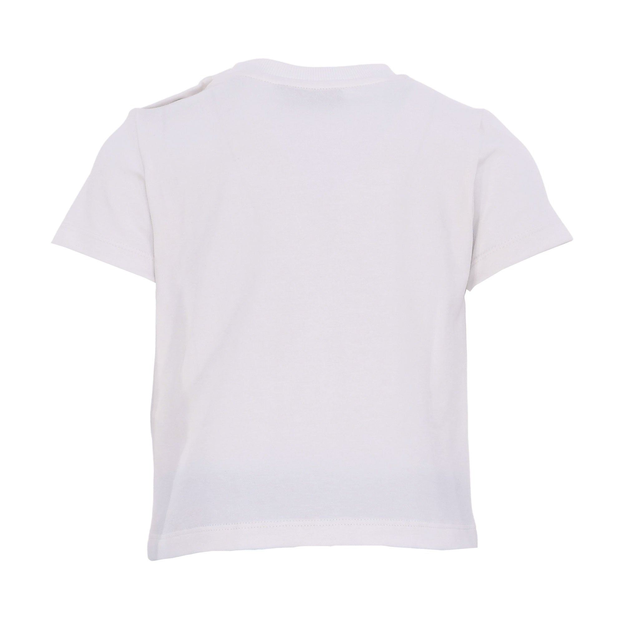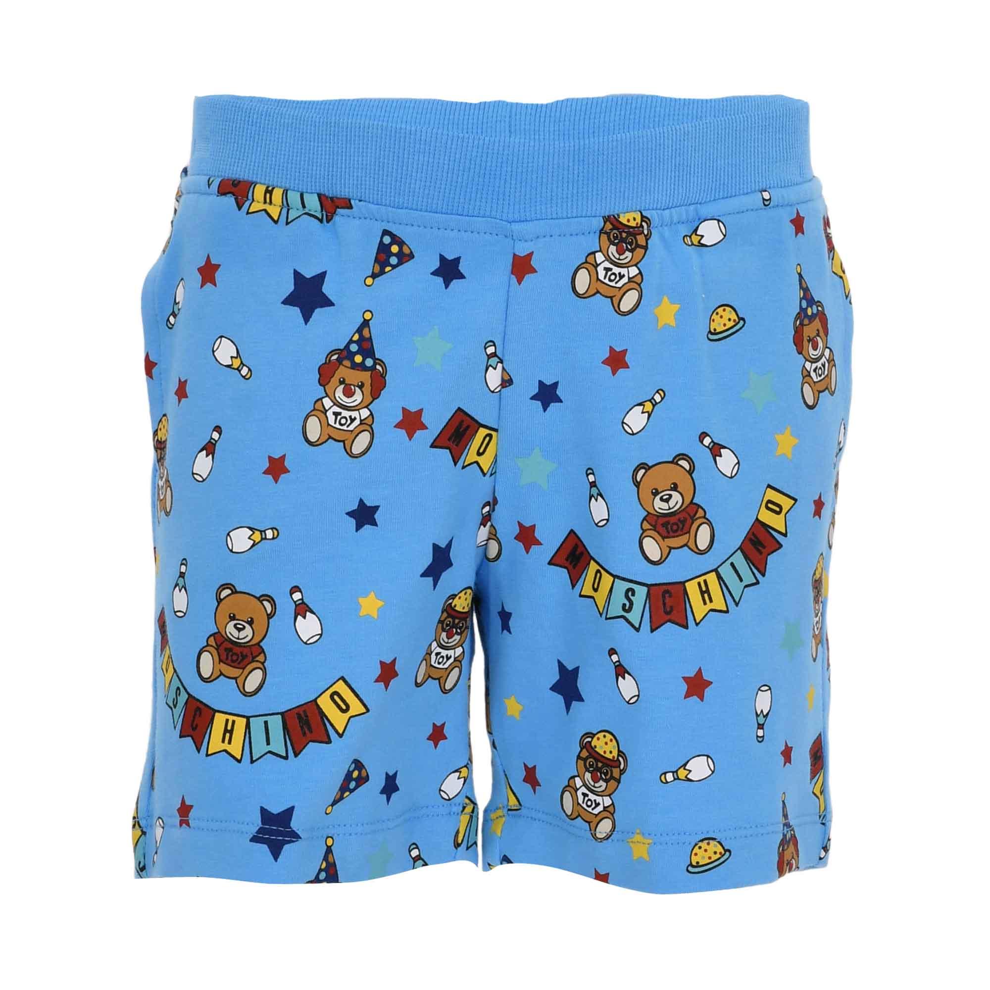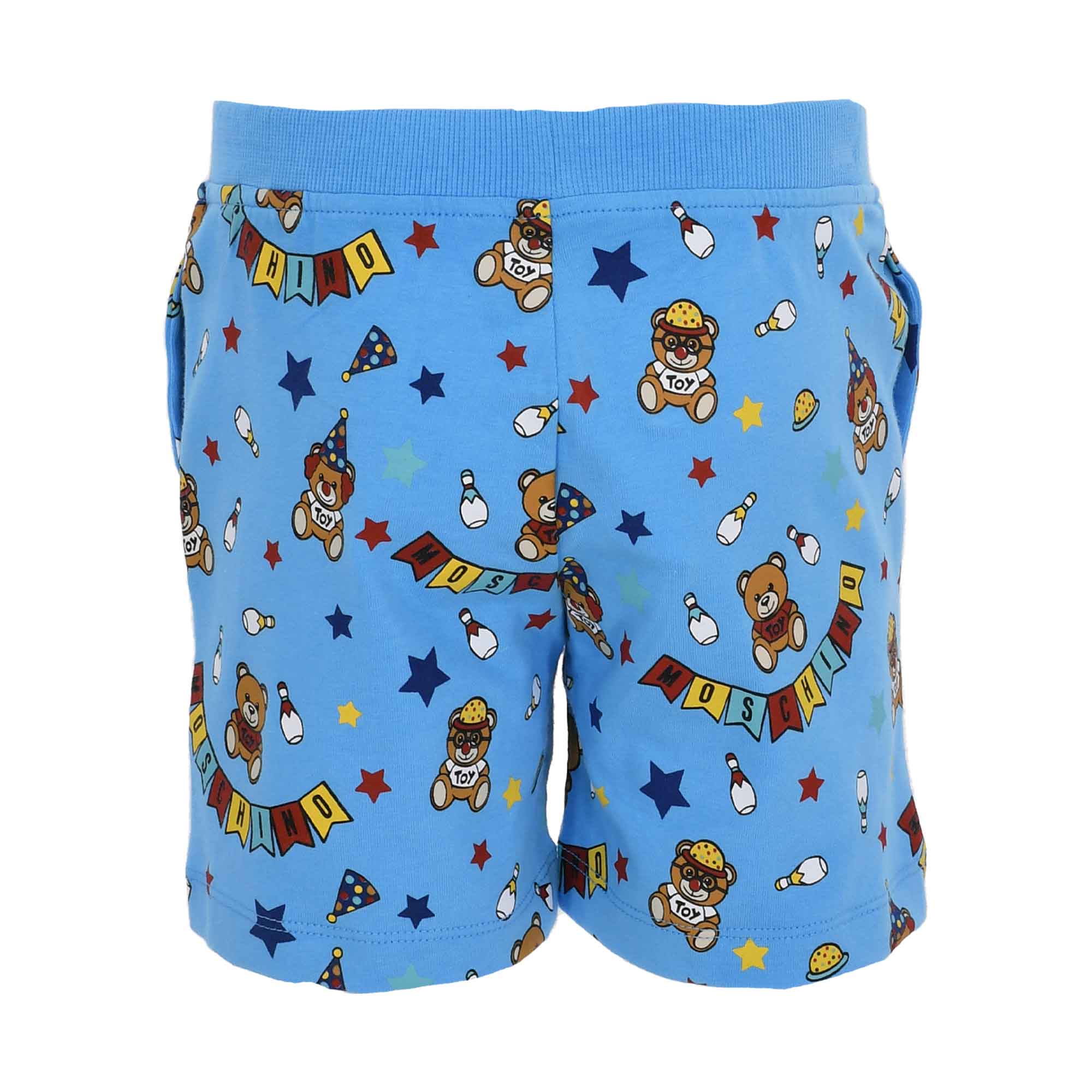 Moschino Baby soft cotton jersey white T-shirt for little boys and girls. It fastens with shoulder poppers and features the Moschino Teddy Bear logo print on the front, along with bowling pin motifs. In addition, there is fun embroidered 3D logo bunting in yellow, red, and blue. It includes shorts with a fun theme, logo and teddy print all over, an elasticized waistband, and two side pockets.
