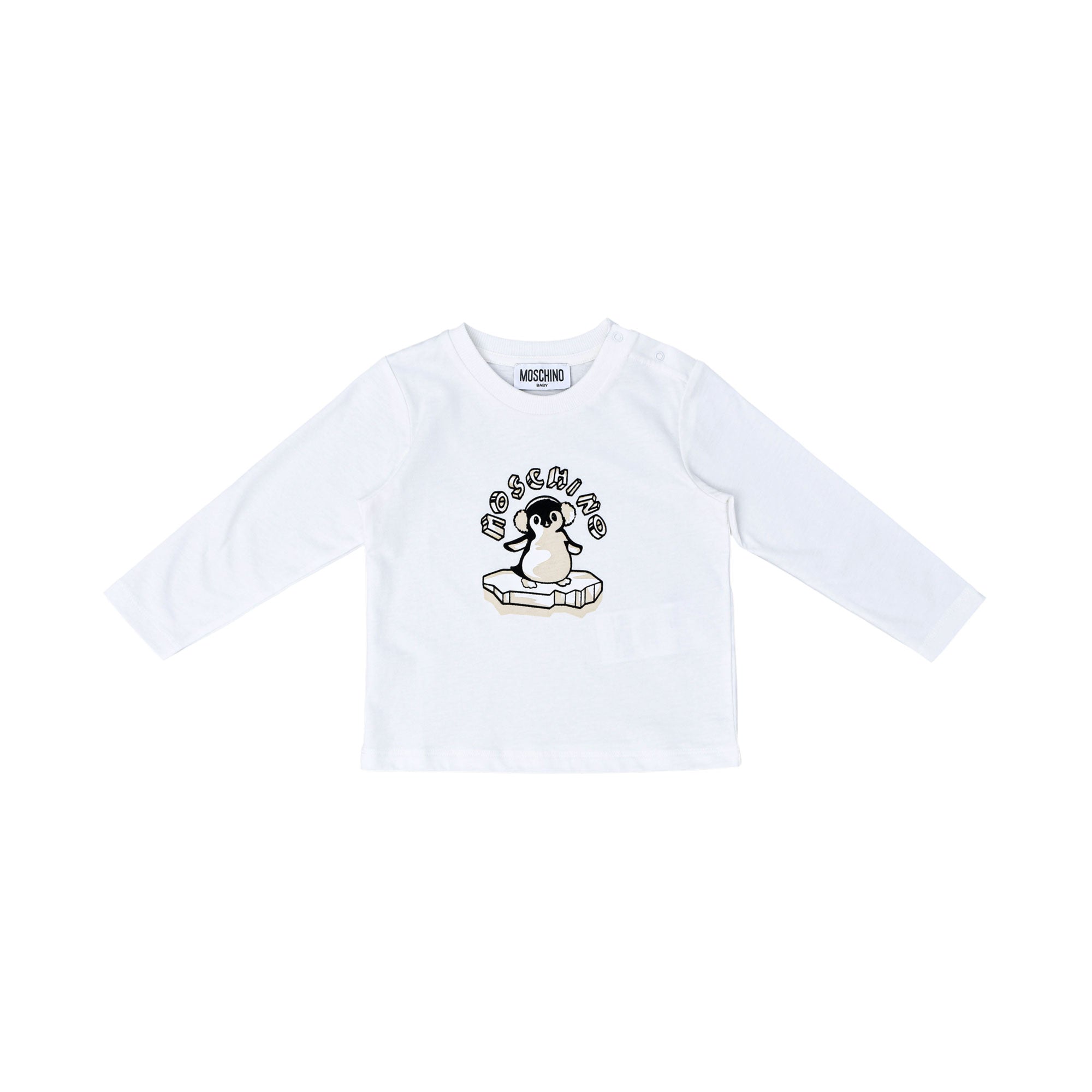 The Moschino Kids Baby Girl's Cloud Long Sleeve Top is a charming and playful addition to any little girl's wardrobe. It features a cute penguin on ice and a bold text logo graphic, adding a touch of whimsy to the design. The tee is made from soft and comfortable fabric, making it perfect for everyday wear. With a classic crewneck and long sleeves, this top is versatile and can be easily paired with different bottoms for a variety of looks. The press-stud on the shoulder adds a convenient and practical element, making dressing and changing a quick and easy task. This Moschino Kids top is a stylish and functional choice for any baby girl. Its simple design and comfortable fit make it a go-to piece for both casual and dressier occasions.