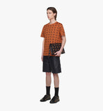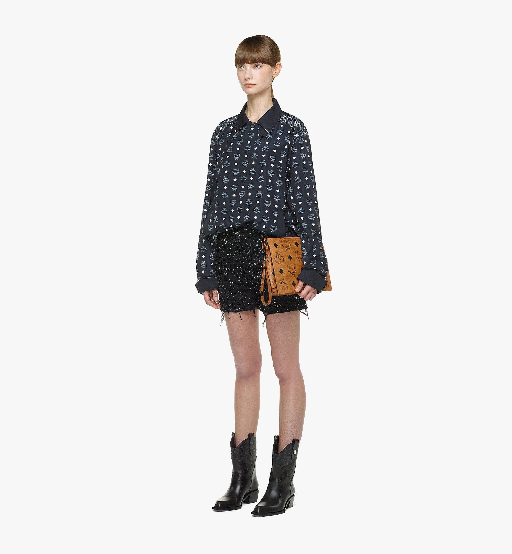 Classic letters, laurels, and diamonds are magnified to express MCM maximalism on a grand scale. Nappa leather accents complete the monogram pouch, accompanied by a detachable Visetos wrist strap.