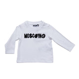 White long sleeve top for younger boys by Moschino Baby. Made from soft cotton, it features a black embroidered symbol logo on the front and it has a ribbed neckline. It fasten with a poppers on the shoulder for easy dressing.