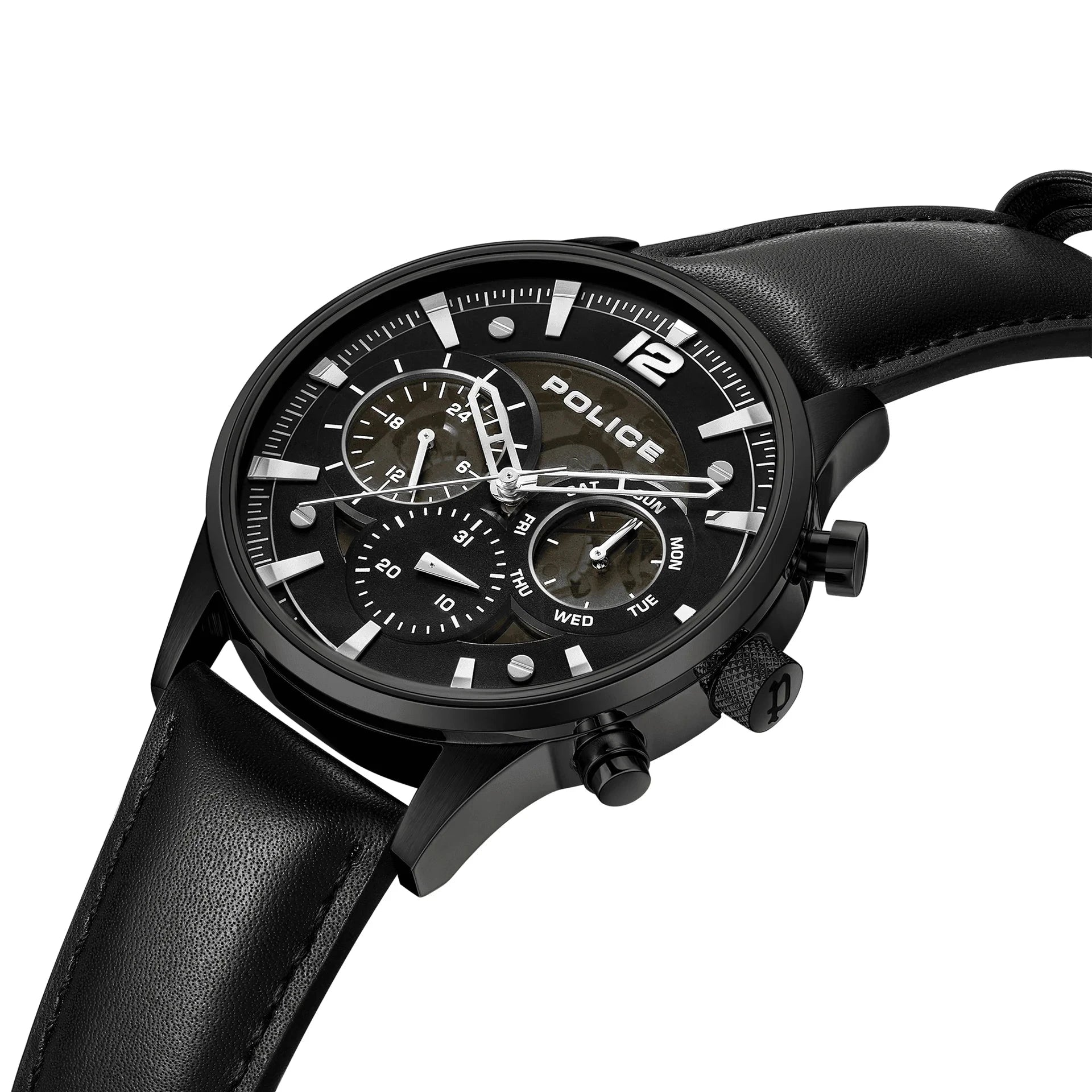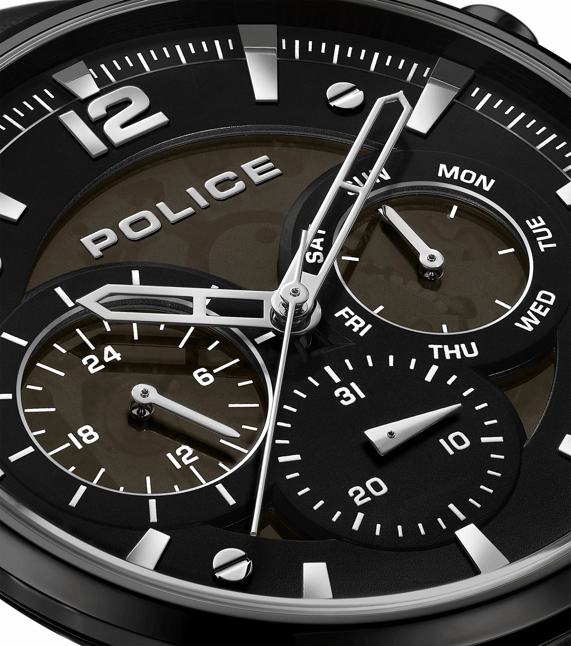 Police once again pushes the boundaries of style and function with the latest multifunction watch. Driver II - an unfiltered expression of sleek functionality - embraces the brand's bold stylistic ethos. Every detail, from the sub-eyes to gun screw elements, is placed purposefully to ensure precision and edginess. The semi-transparent cool grey dial displays the complex mechanics of the multifunction movement, adding a touch of intrigue to this minimalist masterpiece.