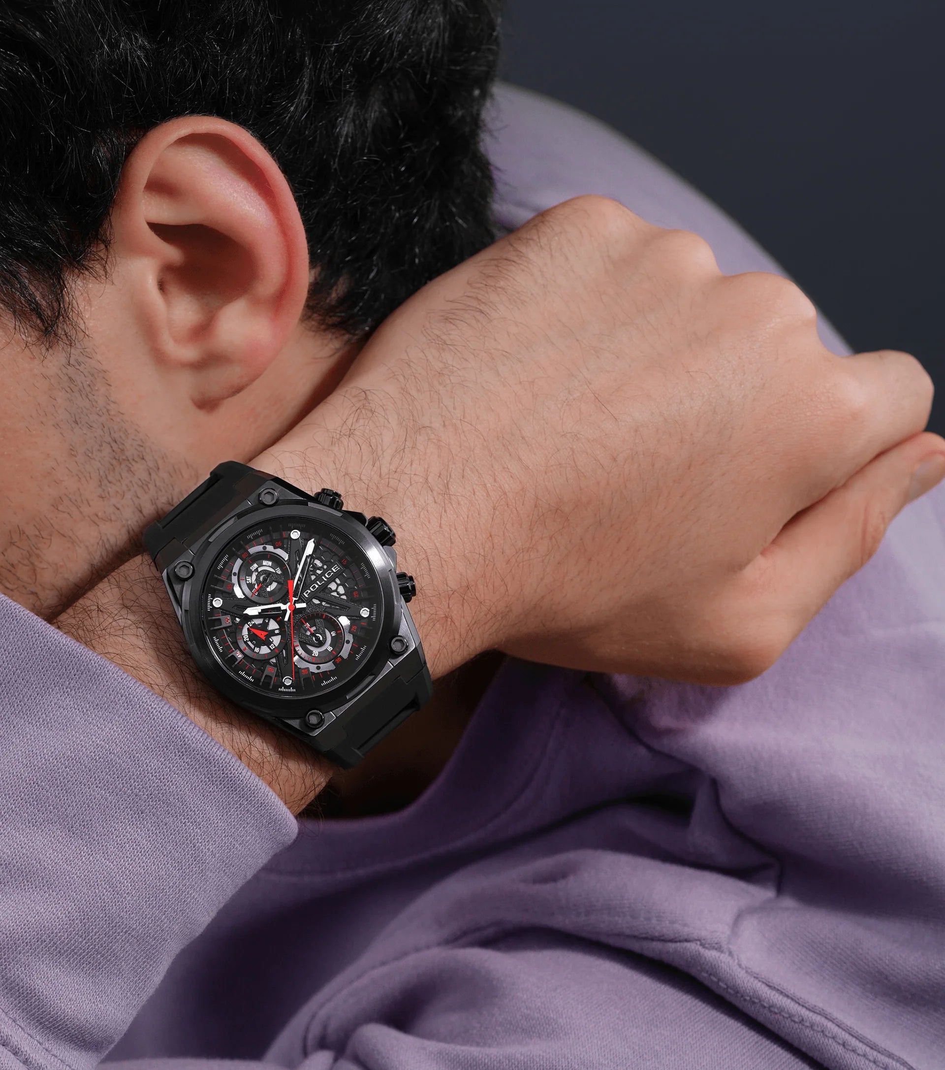 Being bold means infusing your wardrobe with the rebellious personality and dynamic functionality of Police's latest Sonic timepiece. This watch houses a durable multi-movement for superior timekeeping. Sharp in design, all eyes will be drawn to the partial skeleton dial, accentuated by dynamic patterns and bold white & green detailing. Boasting an impressively crafted topring, emphasized by the screw elements, the watch exudes a powerful presence, finished with an easy wear black silicon strap. Own your individuality with Sonic.