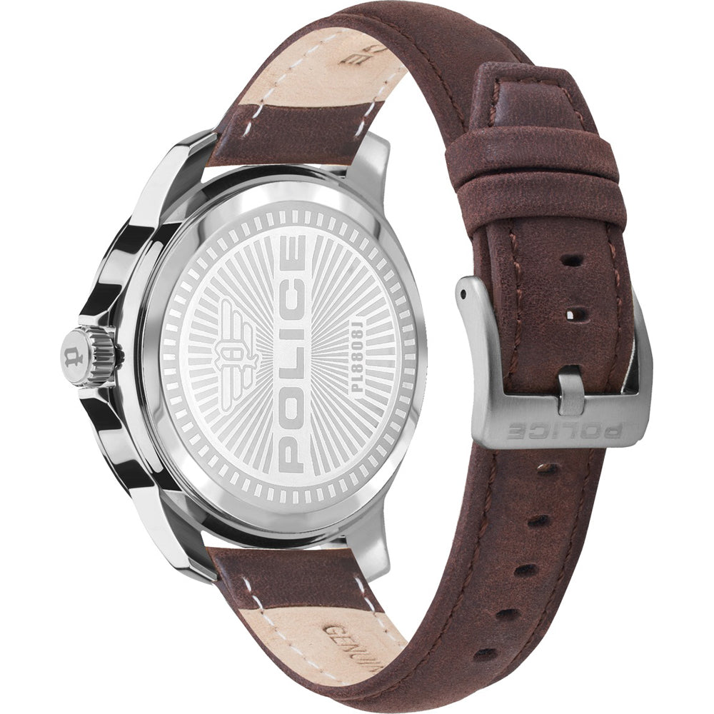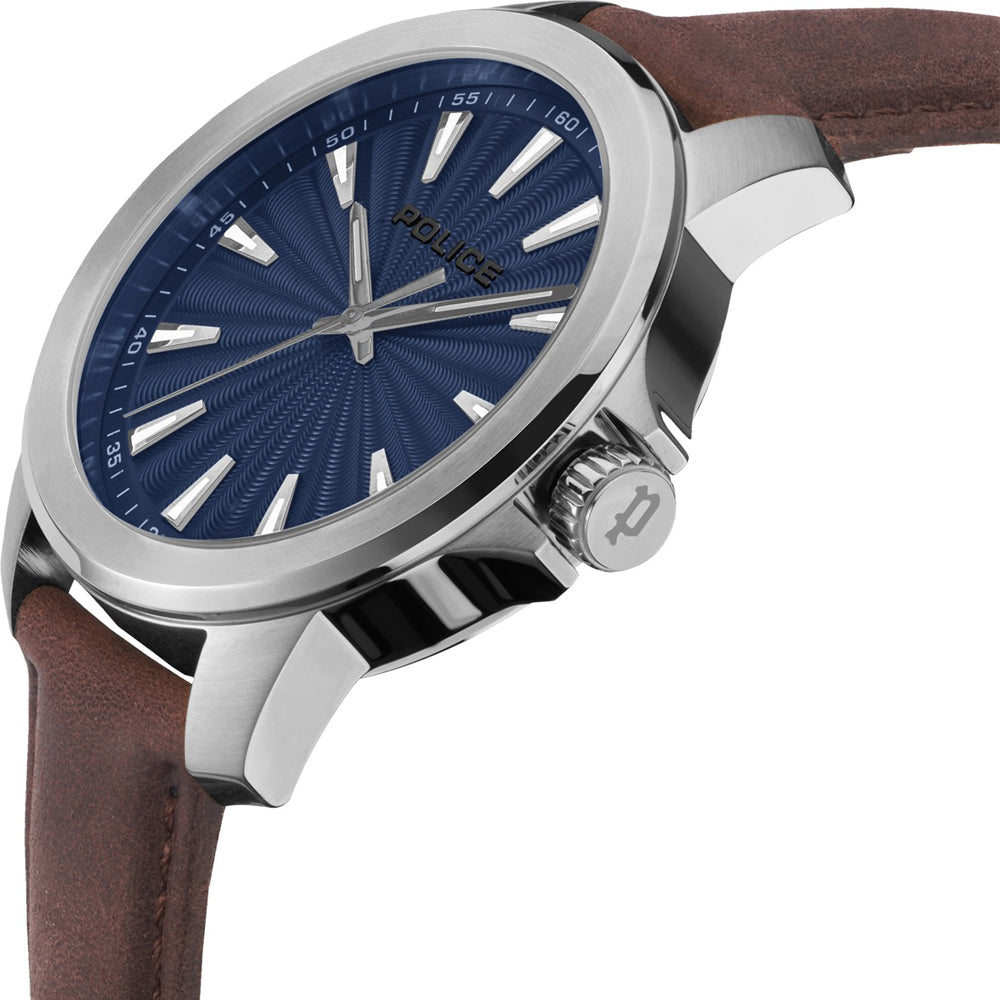 | Brand | Police | Analogue/Digital | Analogue | Case depth approx. | 11.00mm | Primary Material | Stainless Steel | Case Shape | Circle | Case width approx. | 44.00mm | Dial Colour | Navy | Gender | Gents | Glass | Mineral | Model Name | MEnsor | Movement Calibre | VJ21 --> 2035 | Movement | Quartz | Strap colour | Brown | Strap Type | Leather strap | Water Resistance | 50 metres | Weight (g) | 76.00 | BARCODE | 4894816049683 | Guarantee | 2 years |