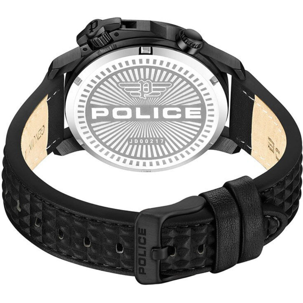 A perfect combination of style and functionality, Automated is built to cut through the noise. Lending a more audacious style to the overall design, the iconic 'Police' signature is stamped right in the centre of the white semi-transparent and Bllack dial and the Black leather strap has a unique pyramid stud. The offbeat crown guard, gives the final touch to the edgy design. Automated is equipped with a backlight feature and bolder hands, offering the watch improved readability in the dark.
