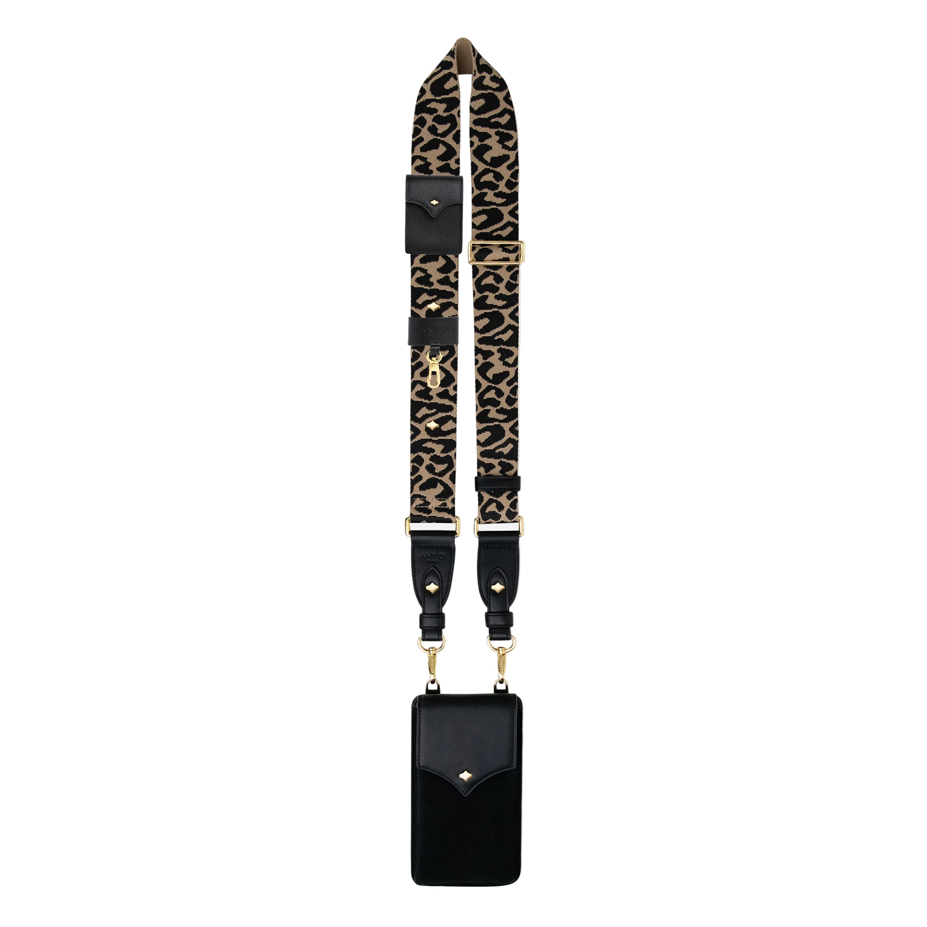 This functional and fashionable strap features a wide, comfortable nylon webbing printed with an exotic black and tan leopard motif, complemented by sleek black pouches for your phone and small accessories.