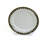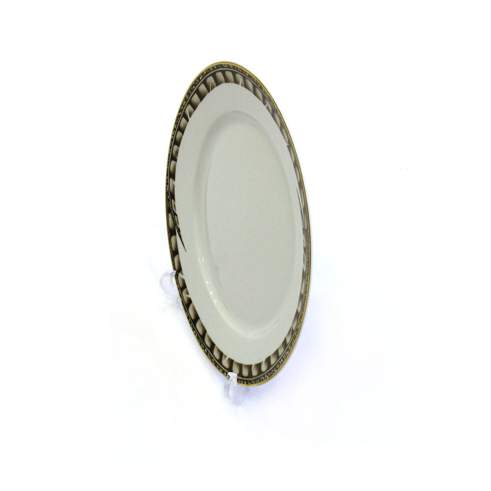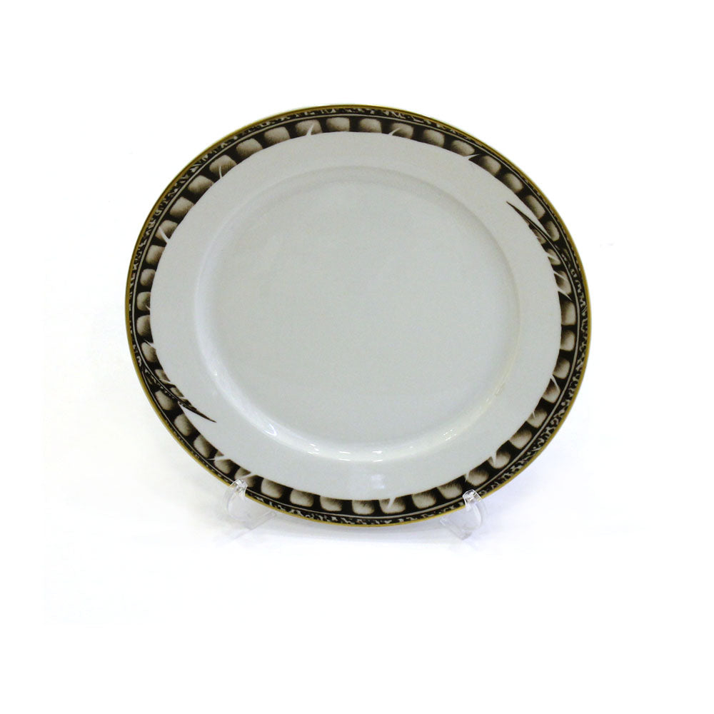 This refined porcelain dinner plate is trimmed with gold and designed with a beautiful feather motif.