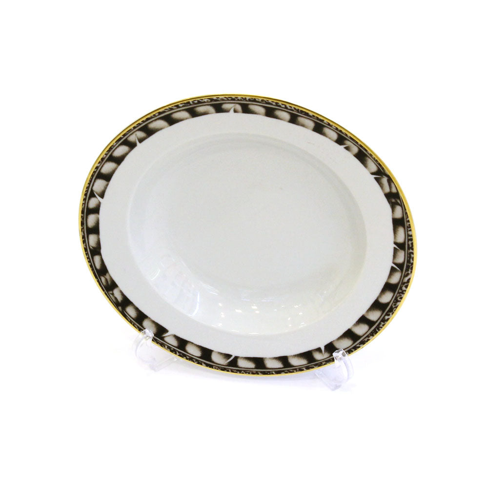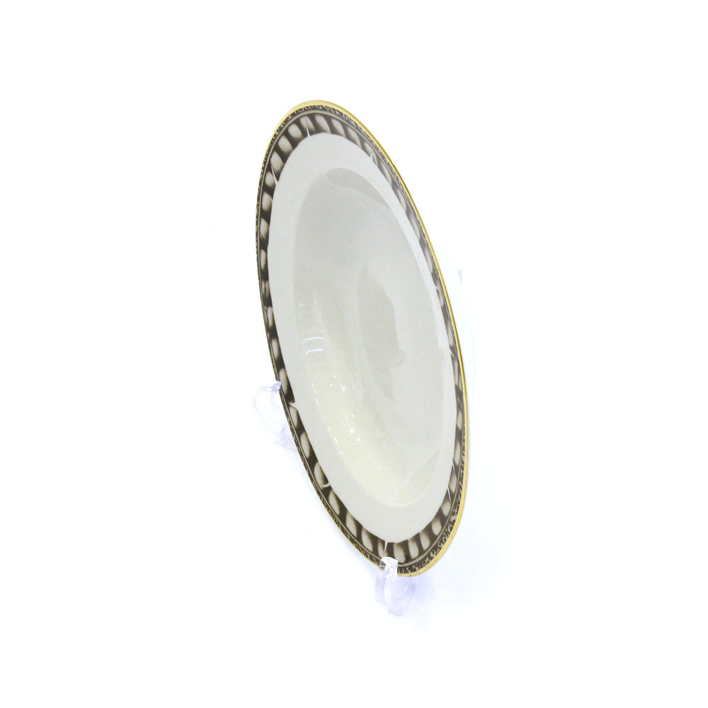This refined porcelain soup bowl is trimmed with gold and designed with a beautiful feather motif.